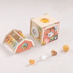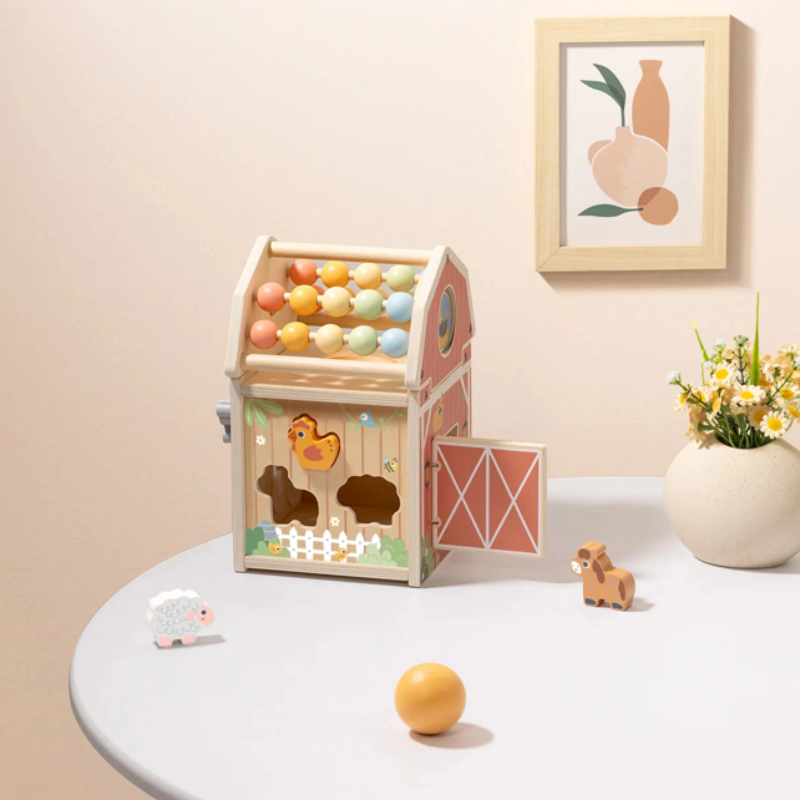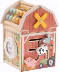 Táto drevená stajňa aktivít je navrhnutá tak, aby deti zábavnou formou rozvíjali svoje zručnosti. Na streche nájdete farebné počítadlo pre prvé krôčiky v počítaní, po stranách triedič tvarov s výrezmi v tvare zvieracích siluet a motorický labyrint so zvieratkami. Otváracie dvere a odnímateľná strecha umožňujú ľahký prístup do vnútra stodoly a rozširujú možnosti hry.