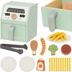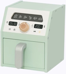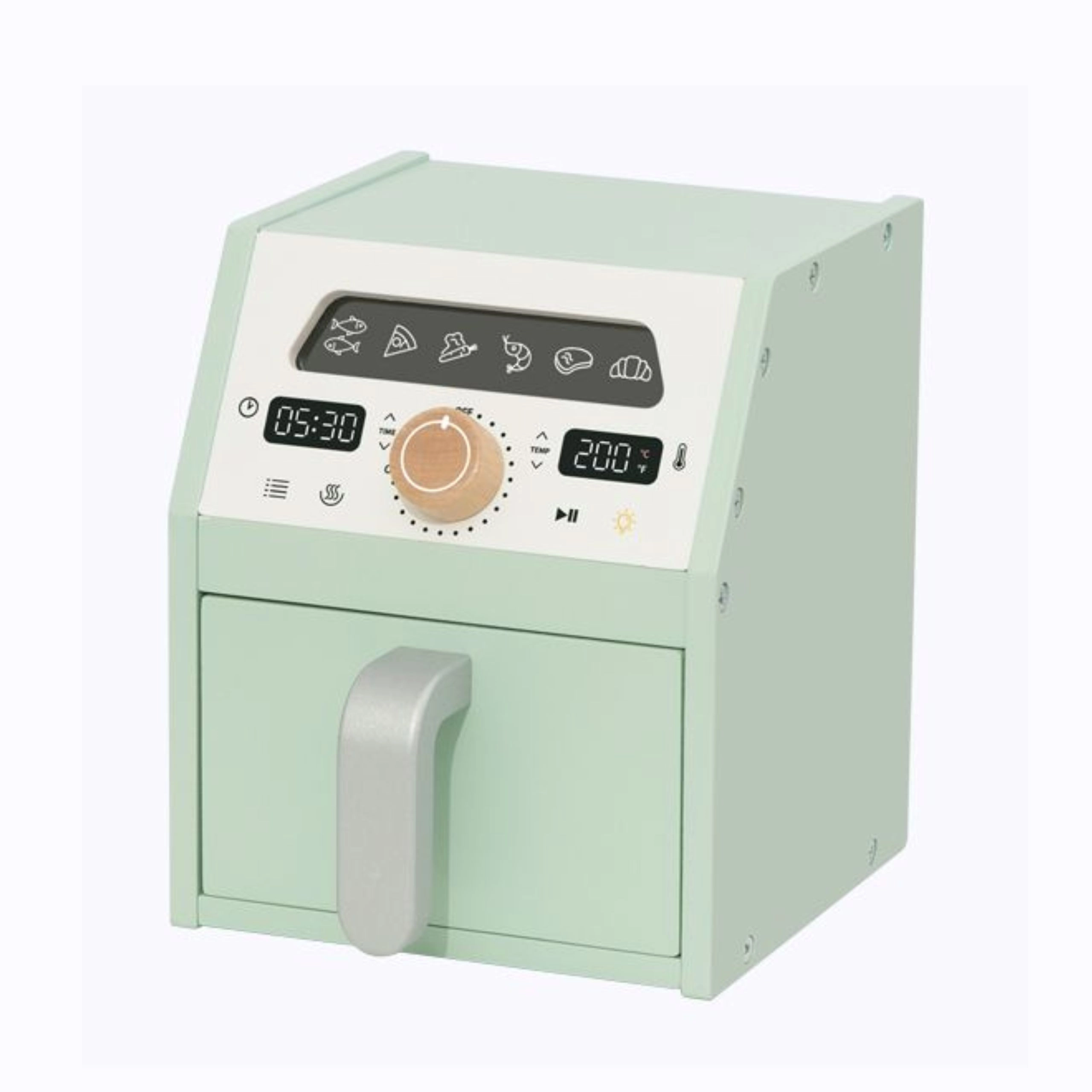 Táto štýlová drevená airfritéza v mentolovej farbe prináša deťom autentický zážitok z varenia – má predný panel s ikonami jedál, otočné regulácie a výsuvný košík, ktorý napodobňuje skutočnú prevádzku spotrebiča. Vďaka bezpečnému drevenému prevedeniu je ideálna na každodennú hru.