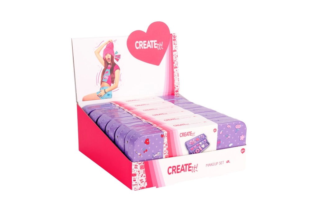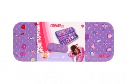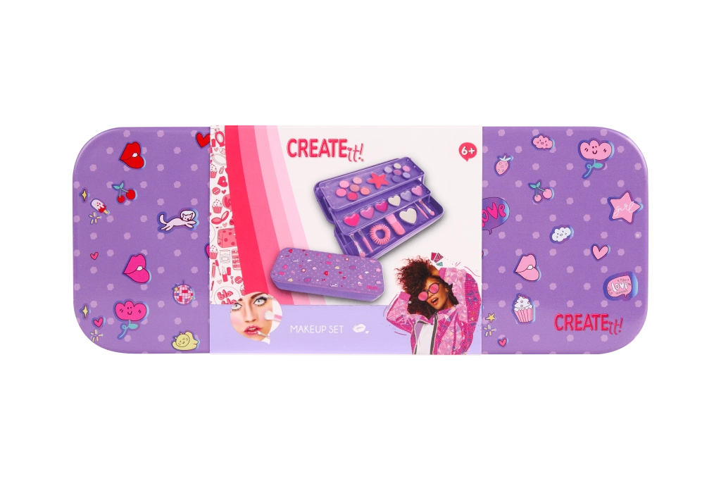 Štýlová fialová make-up kazeta CREATE IT! v praktickej kovovej krabičke ponúka všetko, čo malé parádnice potrebujú. Trojposchodové prevedenie ukrýva 10 očných tieňov, lícenku, 6 leskov na pery, štetčeky, gumičku do vlasov a srdiečkové zrkadielko. Vďaka rozkladacej konštrukcii je obsah prehľadne usporiadaný a ľahko dostupný – ideálny na cesty aj domáce líčenie.