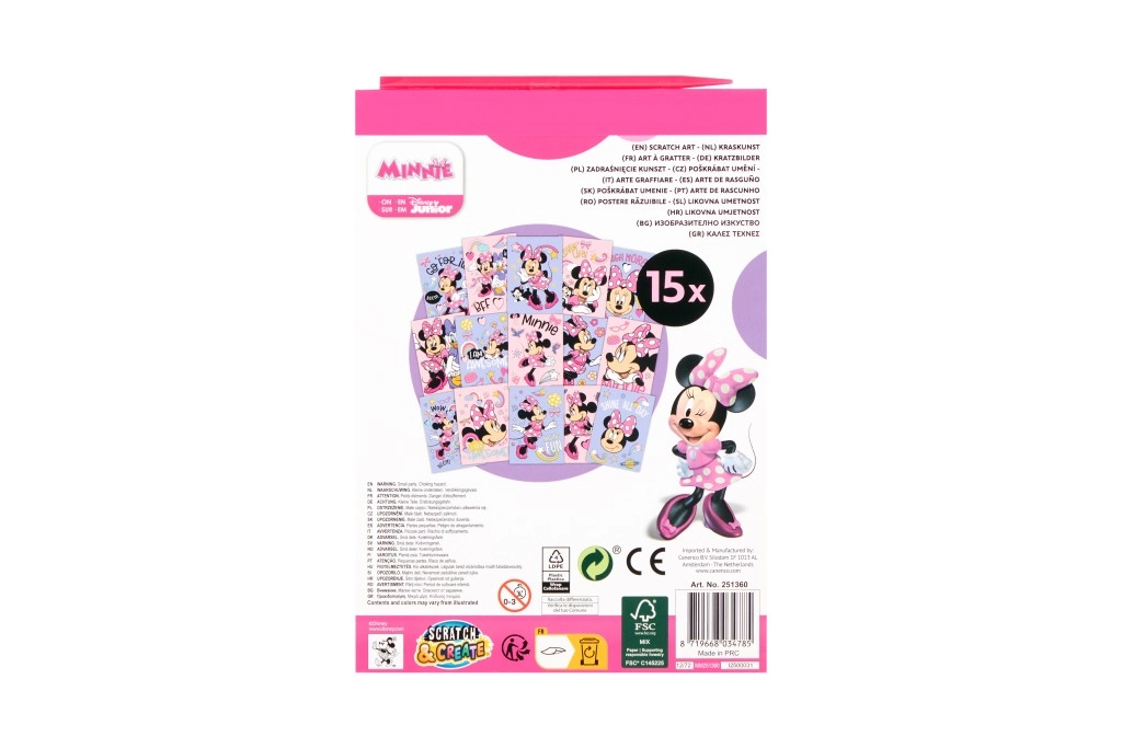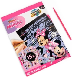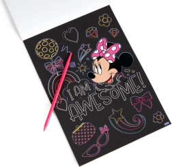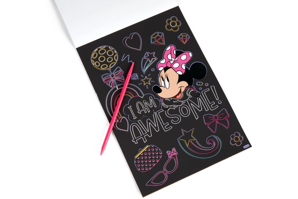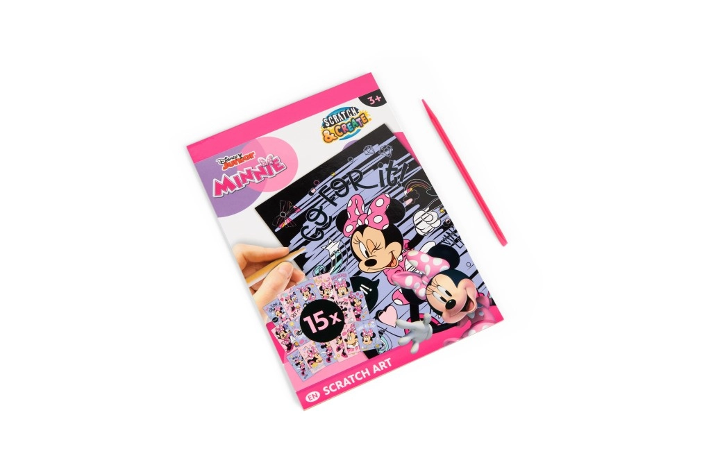 Pod čiernou vrstvou sa ukrývajú živé farby a motívy MINNIE, ktoré deti odhaľujú škrabkou – jednoduché, zábavné a návykové tvorenie.