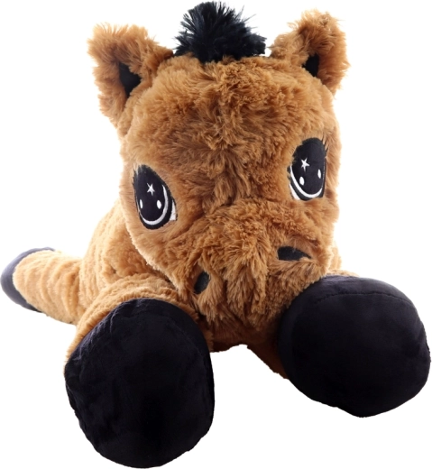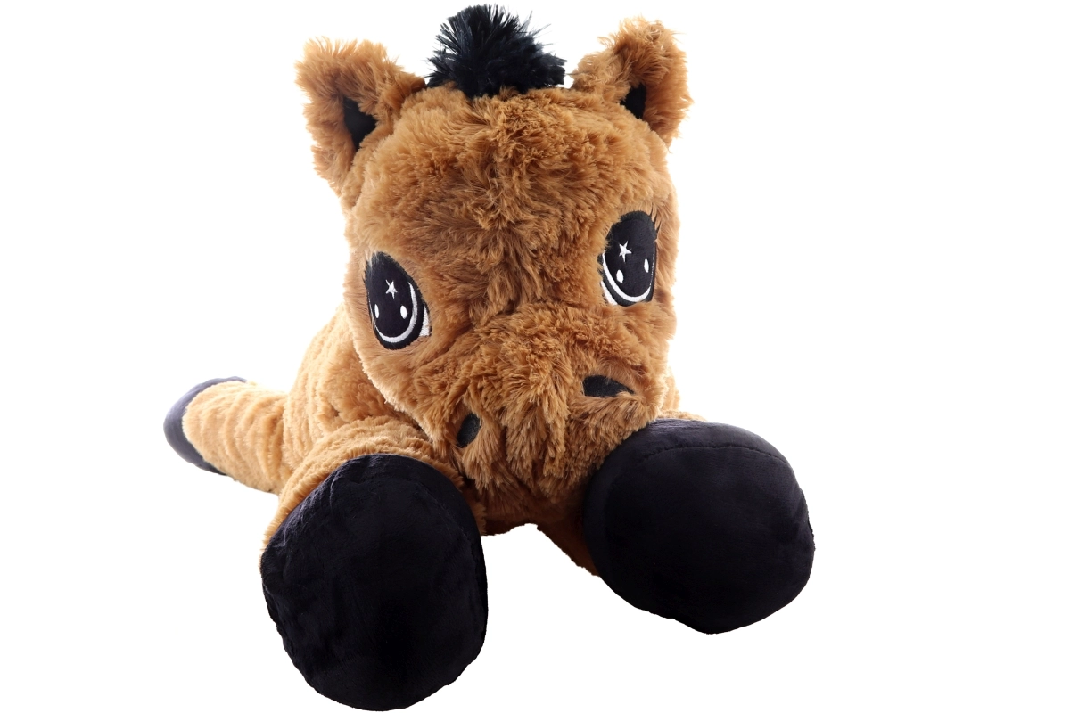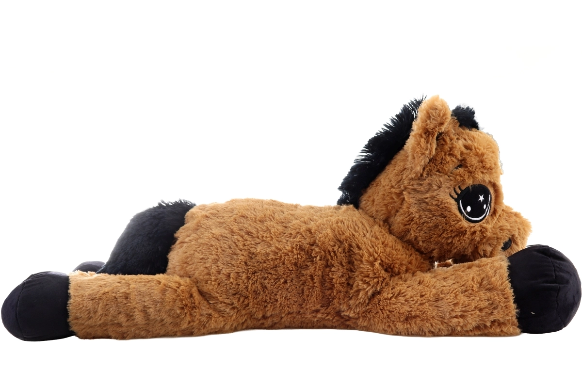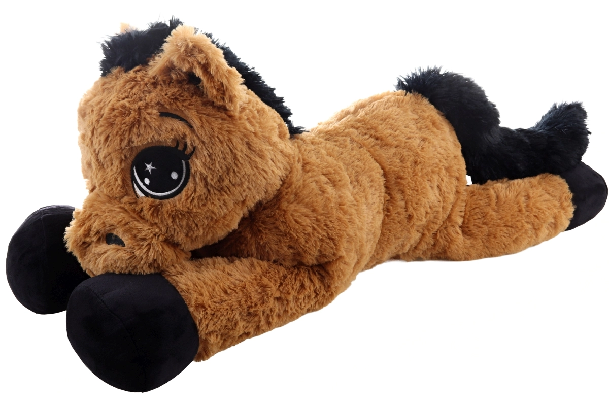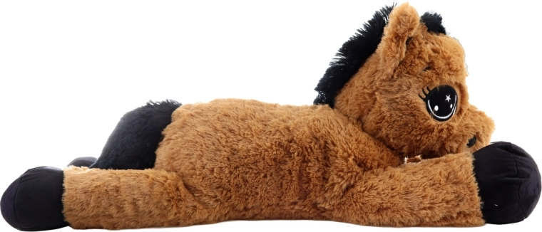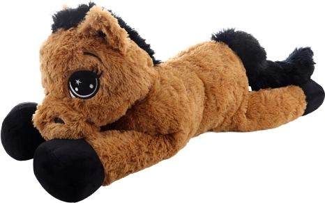 Tento hnedý ležiaci plyšový kôň poteší na prvý dotyk. Má veľké vyšívané oči, mäkkú hrivu a chvost a pôsobí ako mojkavý kamarát aj pohodlná opora pri čítaní alebo sledovaní rozprávok. Rozmery 80 × 32 × 25 cm zaručujú dostatok priestoru na objatie a oddych.