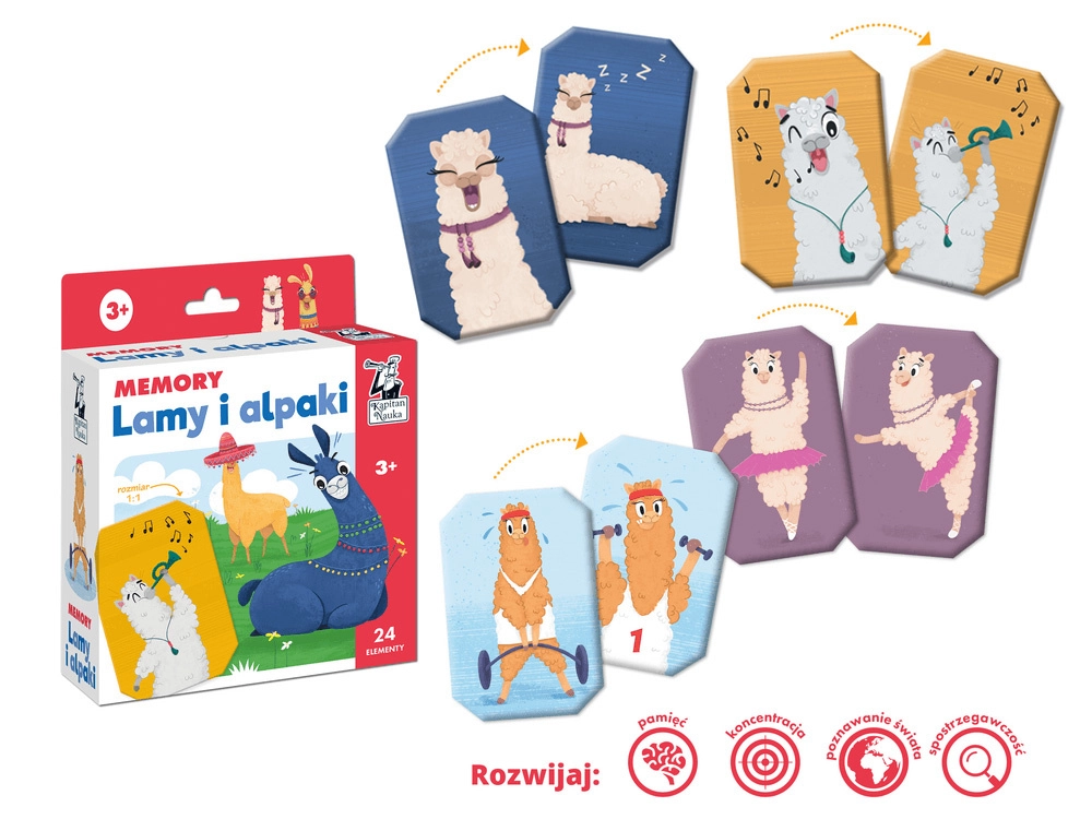 Zábavné pexeso s motívmi priateľských lám a alpák pre deti od 3 rokov. Hra rozvíja pamäť, pozornosť a sústredenie pri hľadaní dvojíc. Balenie obsahuje 24 kartičiek (12 párov) s veľkosťou cca 9 × 6 cm s veselými ilustráciami – baletka, muzikant, pirát a ďalší.