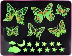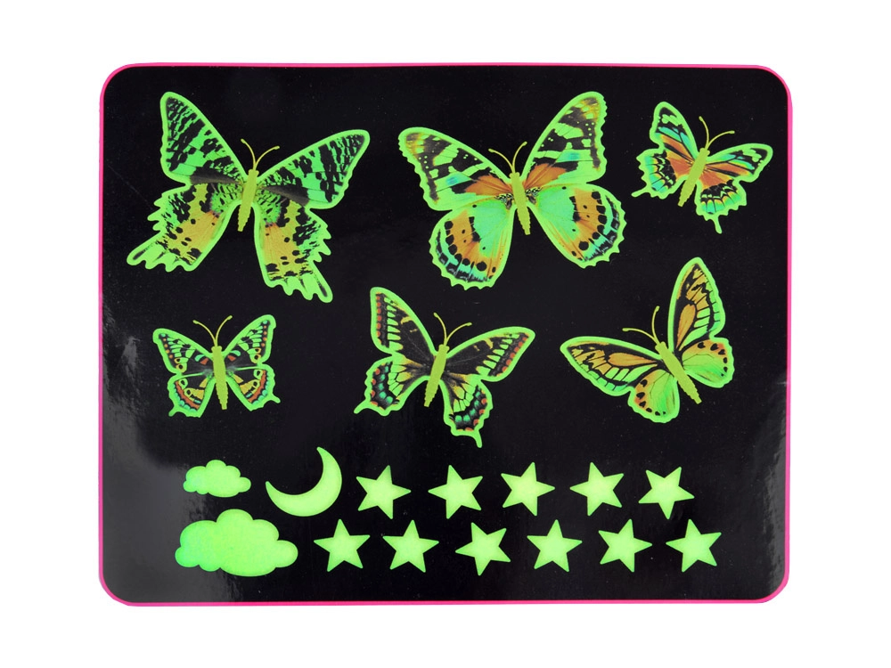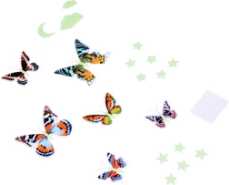 Premenite steny a strop na rozprávkovú nočnú oblohu. Farebné motýle s detailnými krídlami dodajú interiéru život a počas tmy sa rozsvietia fosforeskujúce prvky – hviezdy, mesiačik a obláčiky – pre príjemné, tlmené svetlo. Set je skvelý do detskej izby, spálne aj herne.