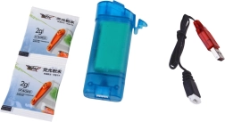 Súčasťou je batéria 7,4 V 500 mAh, USB nabíjačka a dva sáčky na prípravu fluorescenčnej vody pre efektné nočné strieľanie.