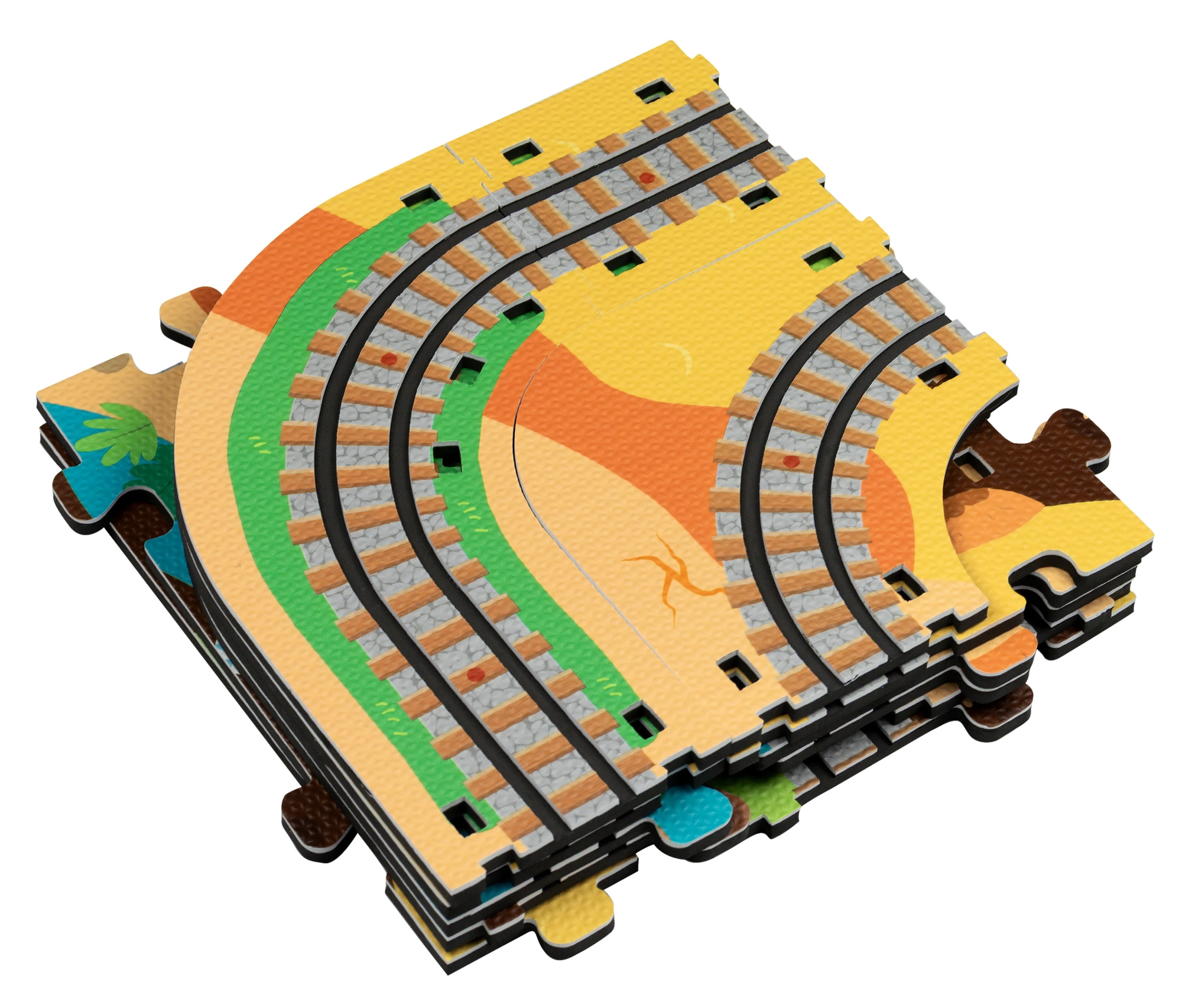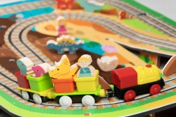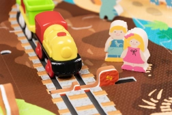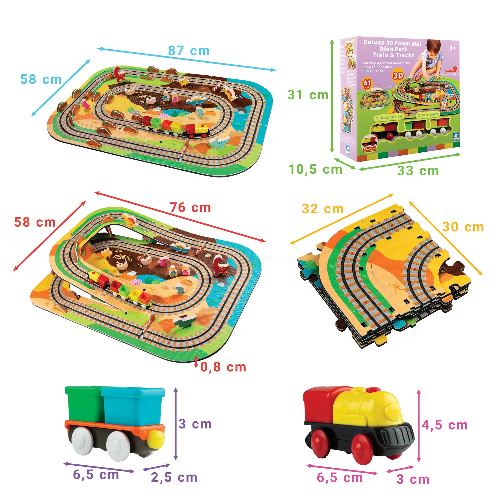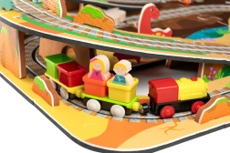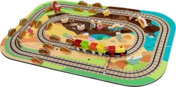 Súčasťou je 12 kusov koľajníc, 42 tematických doplnkov a praktické krabičky do vagónikov na prevoz pasažierov či drobností. Mäkký, odolný a bez zápachu materiál EVA zaisťuje pohodlné a bezpečné hranie. Produkt spĺňa EN 71, RoHS 2011/65/EU a má CE označenie.