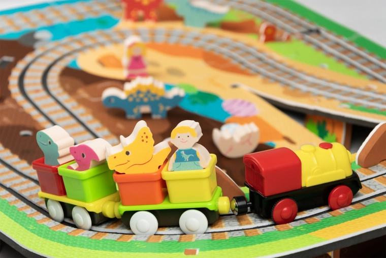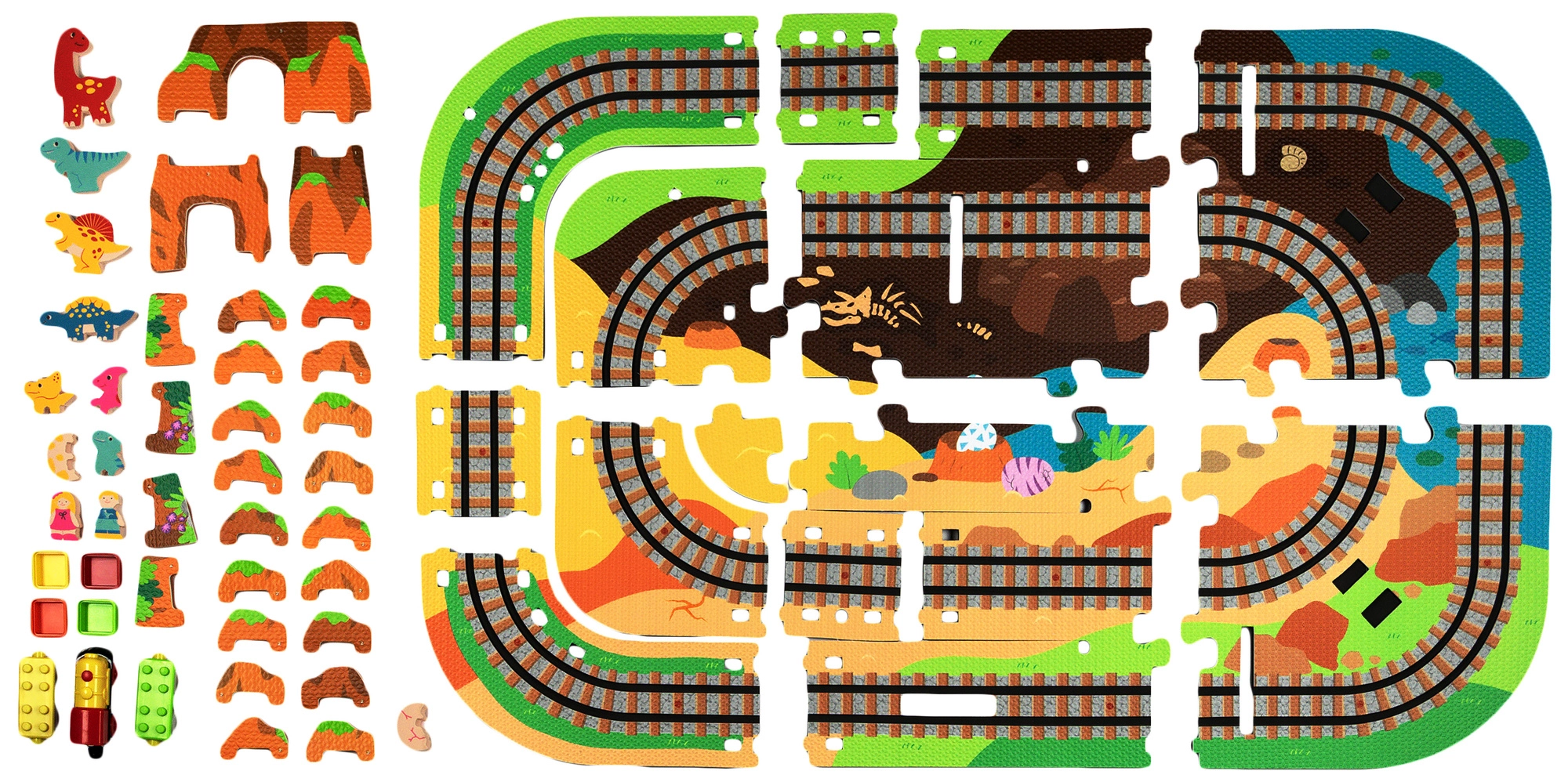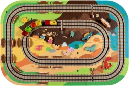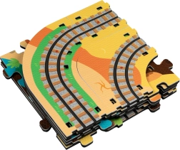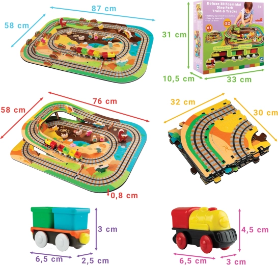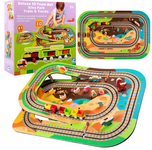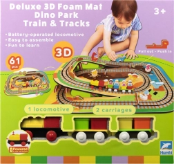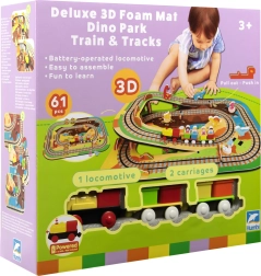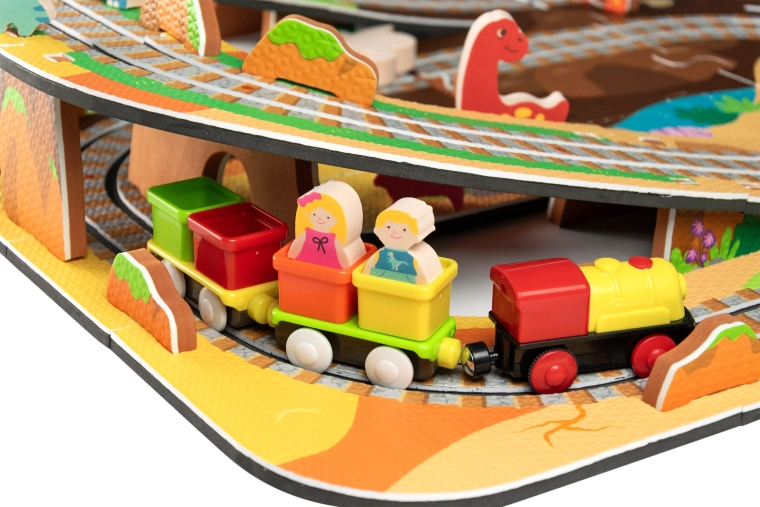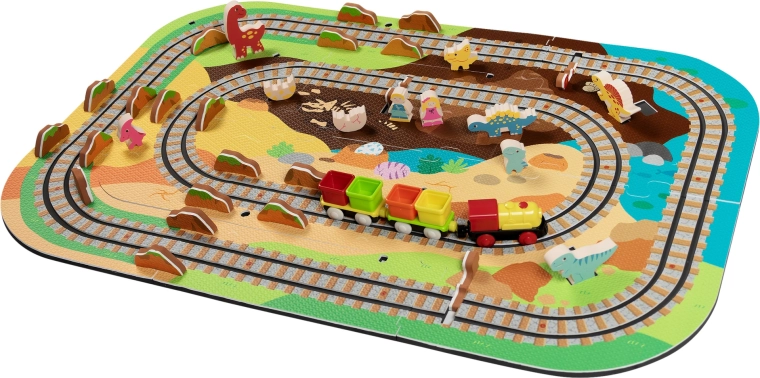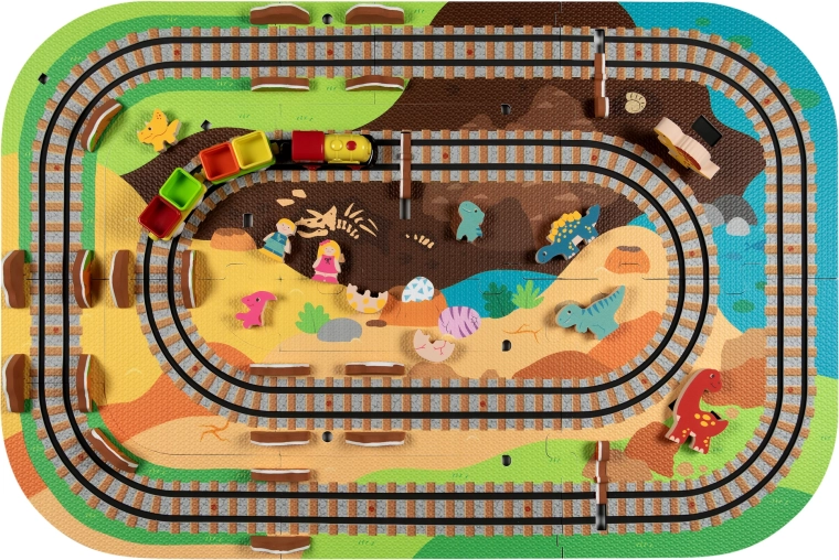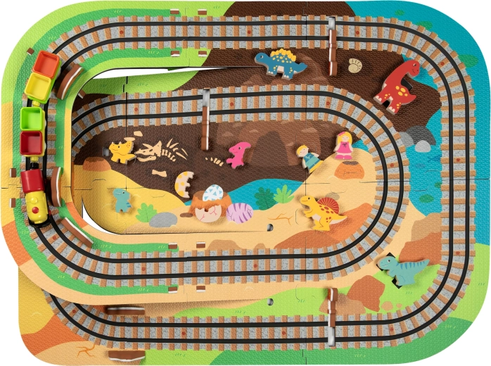 Táto kreatívna sada kombinuje penové puzzle z EVA s motívom dinosaurov a koľajovú trať pre vláčik. Diely do seba ľahko zapadajú a umožňujú postaviť roviny aj strmé nájazdy. Lokomotíva s vagónikmi (na batérie) sa po trati plynulo pohybuje a deti si môžu hru obohatiť o drevené/penové figúrky dinosaurov, skaly a tunely.