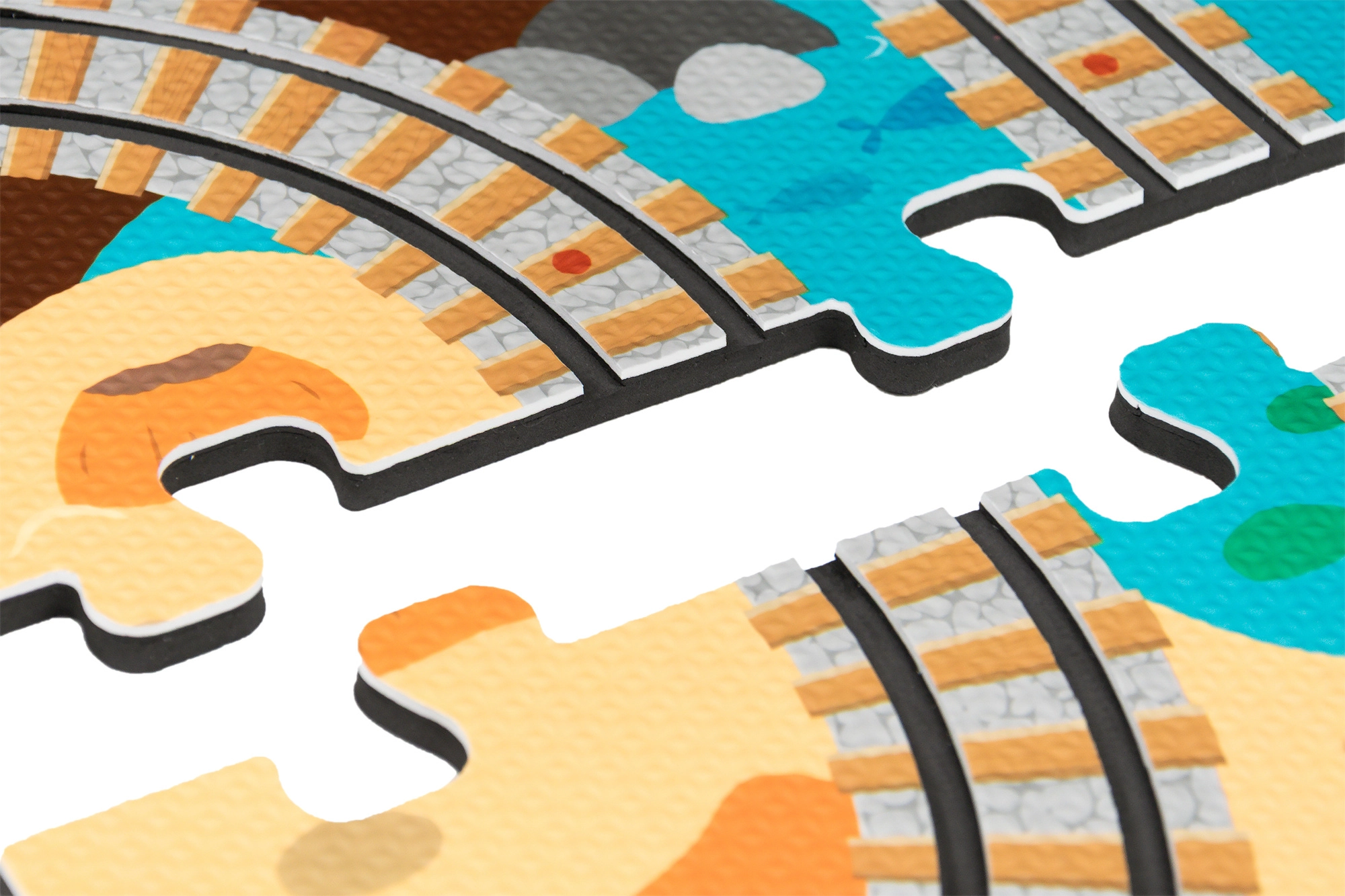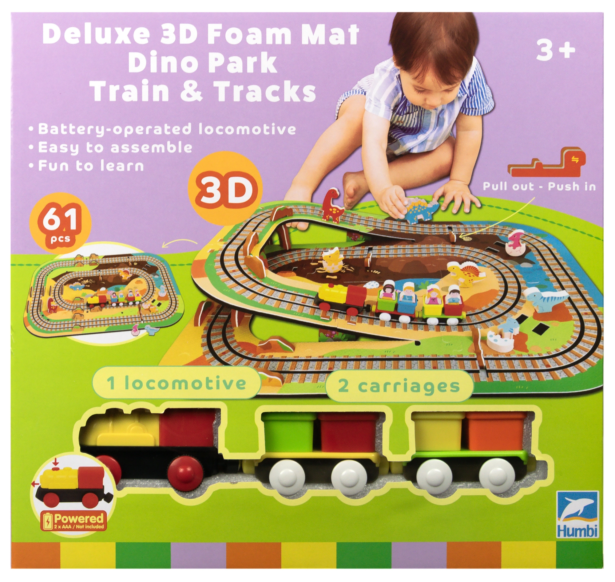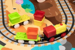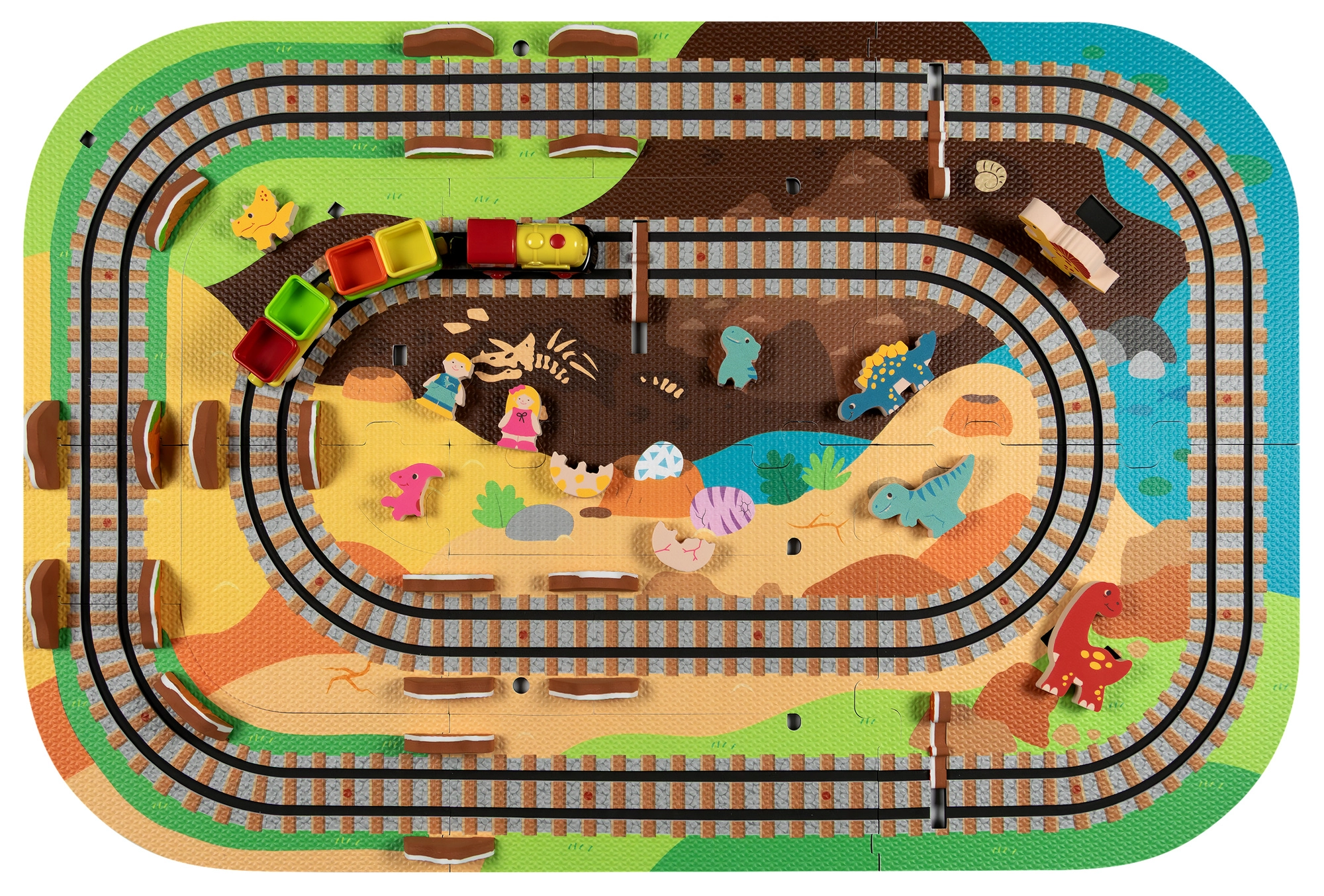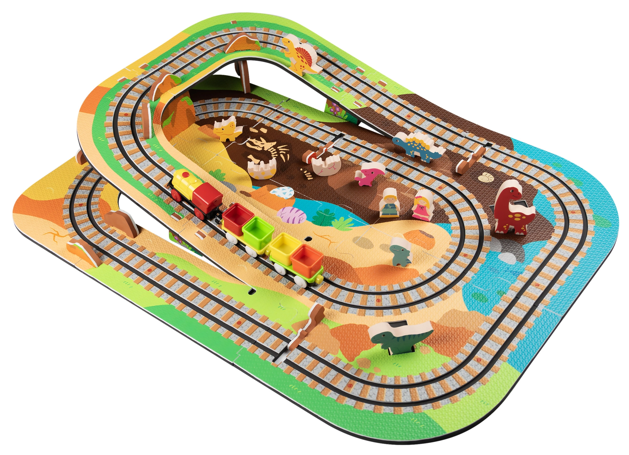 Táto kreatívna sada kombinuje penové puzzle z EVA s motívom dinosaurov a koľajovú trať pre vláčik. Diely do seba ľahko zapadajú a umožňujú postaviť roviny aj strmé nájazdy. Lokomotíva s vagónikmi (na batérie) sa po trati plynulo pohybuje a deti si môžu hru obohatiť o drevené/penové figúrky dinosaurov, skaly a tunely.