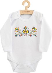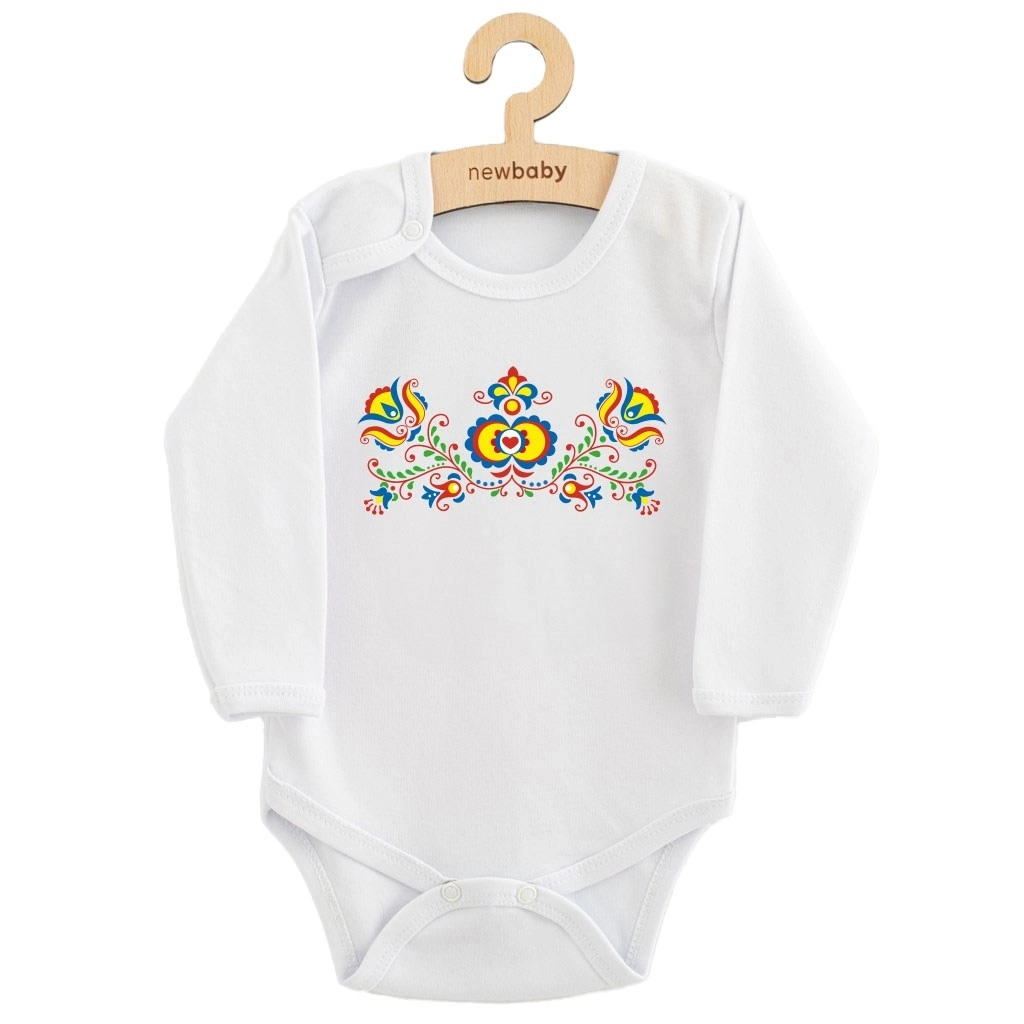 Štýlové detské body s dlhým rukávom a folklórnym motívom od značky NEW BABY spája tradičný vzor s moderným dizajnom. Je z 100 % jemnej bavlny, šetrnej k citlivej pokožke a má praktické zapínanie na patentky na ramienku a medzi nohavičkami pre ľahké obliekanie aj prebaľovanie. Certifikované farby a materiál s OEKO‑TEX STANDARD 100 zaručujú bezpečie aj pre novorodencov.
