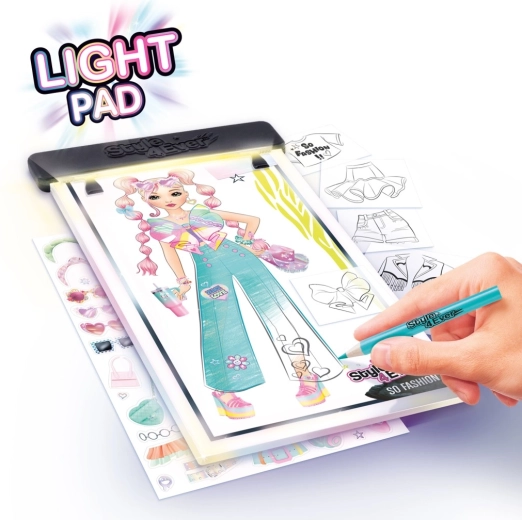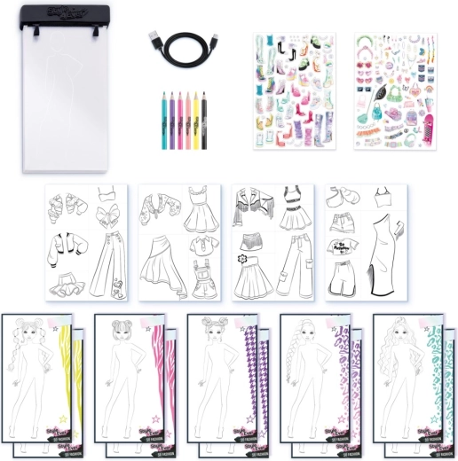 Táto štýlová sada je ideálna pre malých módnych nadšencov, ktorí chcú navrhovať ako skutoční dizajnéri. Podsvietená podložka uľahčuje prekresľovanie a vrstvenie šablón, takže krásne a čisté návrhy vzniknú raz‑dva. Vďaka bohatej výbave môžete kombinovať rôzne siluety, doplnky a farby a vytvárať tak jedinečné kolekcie.
