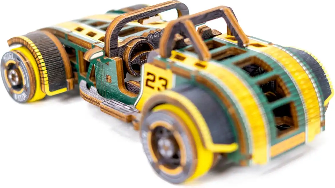 Model je vybavený gumeným pohonom, vďaka ktorému dokáže po natiahnutí prejsť približne 1 m. Predná náprava je riadená, takže svoj roadster môžete nasmerovať tam, kam chcete. Elegantná drevená krabička s magnetickými klipmi funguje nielen ako darčekové balenie, ale aj ako praktický stojan na vystavenie.