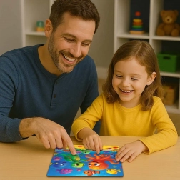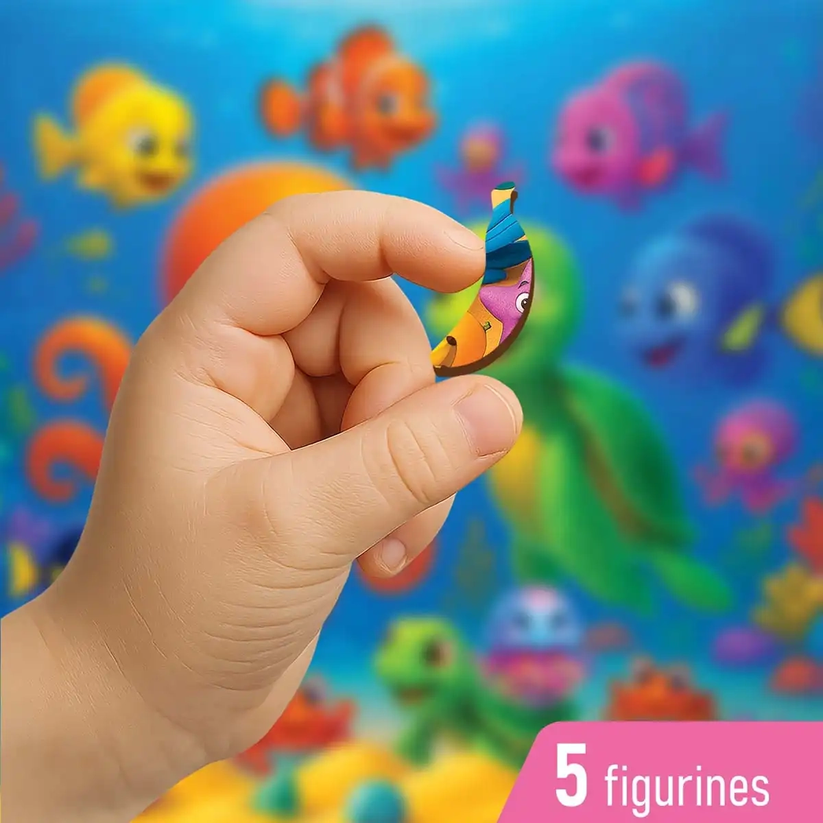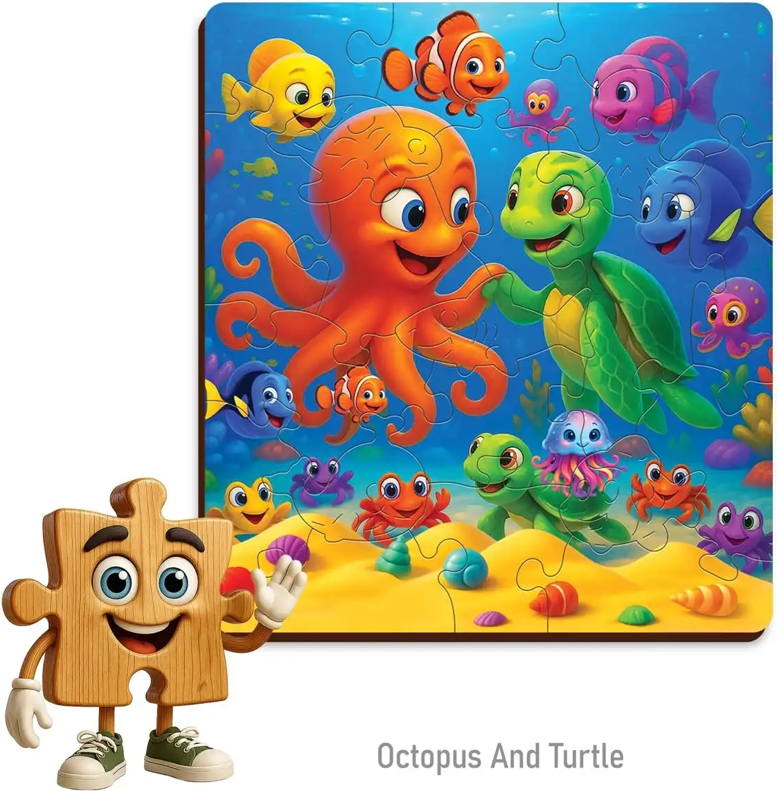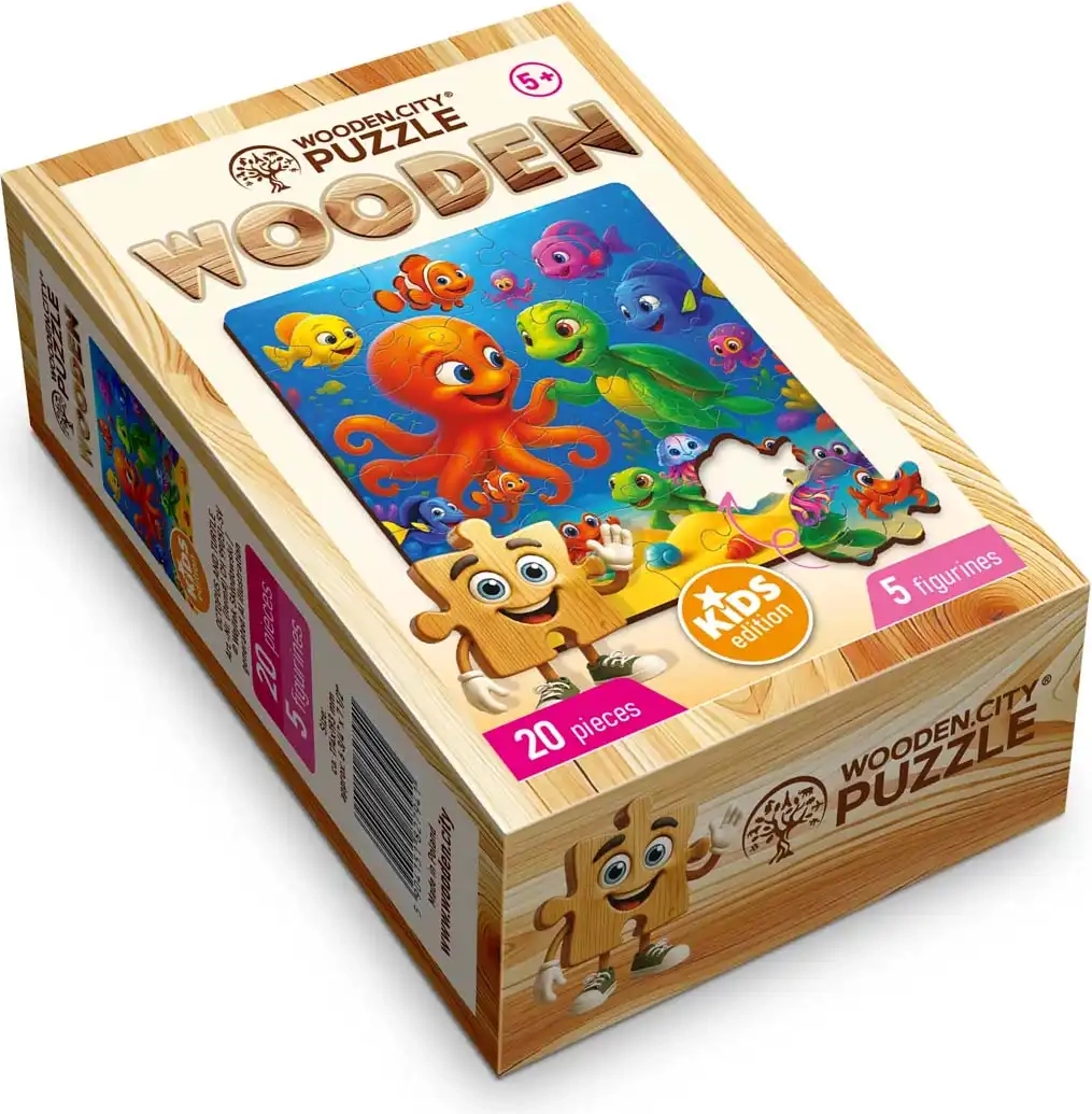 Drevené puzzle WOODEN CITY s motívom chobotnice a korytnačky prenášajú deti do fascinujúceho podmorského sveta. Každý dielik je vyrobený s maximálnou presnosťou, aby do seba perfektne zapadal a výsledkom bola okúzľujúca scéna s rozmermi cca 19,3 × 17,4 cm.