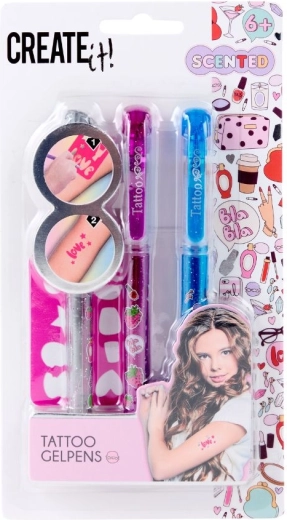 Staň sa malou tatérkou a vytvor si vlastný štýl s farebnými a voňavými tetovacími perami CREATE IT!. Vďaka trblietavému gélovému atramentu budú tvoje motívy výrazné a hravé. Použi priložené šablóny pre precízne tvary, alebo si navrhni originálny motív presne podľa seba. Dočasné tetovanie jednoducho zmyješ vodou, takže môžeš experimentovať každý deň.