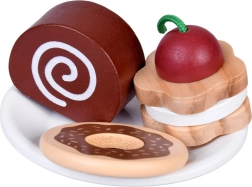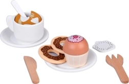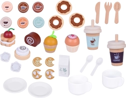 Bohaté príslušenstvo zahŕňa šálky so spodkami a lyžičkami, poháriky s viečkami so sebou (Tea, Coffee), kartón mlieka, príbory, rôzne koláčiky, muffiny, sušienky a čokoládky, aj jednoduché menu. Všetko je dokonale prispôsobené malým rúčkam a podporuje jemnú motoriku, očnú–ručnú koordináciu a spoločenské zručnosti.