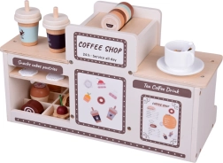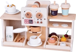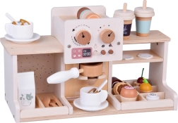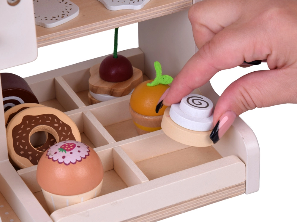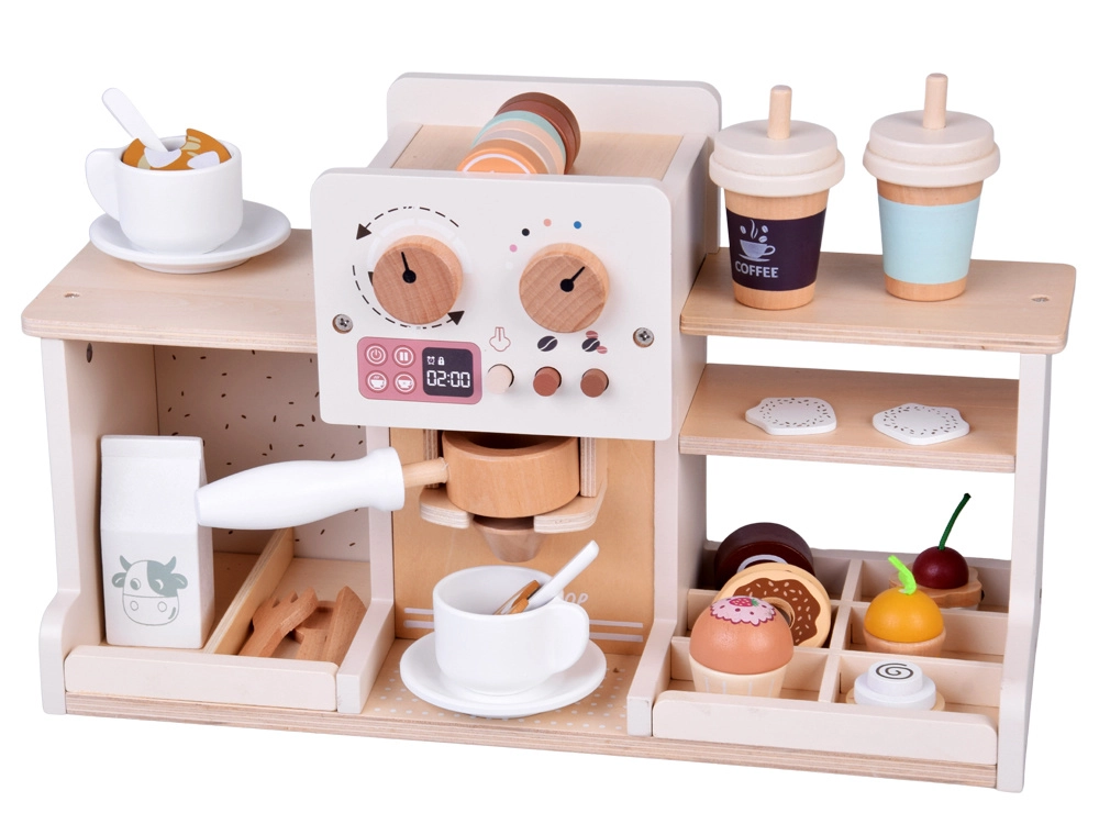 Objavte čaro baristického sveta s drevenou kaviarňou, ktorá vyzerá aj funguje ako skutočná. Deti môžu „nastavovať“ silu kávy pomocou otočných gombíkov, vkladať kolbu/portafilter, vyberať kapsuly s kávou či čajom, peniť „mlieko“ a podávať dezerty na tanierikoch. Pevná drevená konštrukcia s bezpečnými farbami a jemná pastelová paleta zaručujú dlhú životnosť aj krásny vzhľad v detskej izbe.