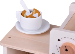 Otočné gombíky, potlač ikon a kolba vytvárajú pocit skutočnej prípravy kávy. Deti môžu vkladať drevené kapsuly a „nastaviť“ ideálny nápoj.
