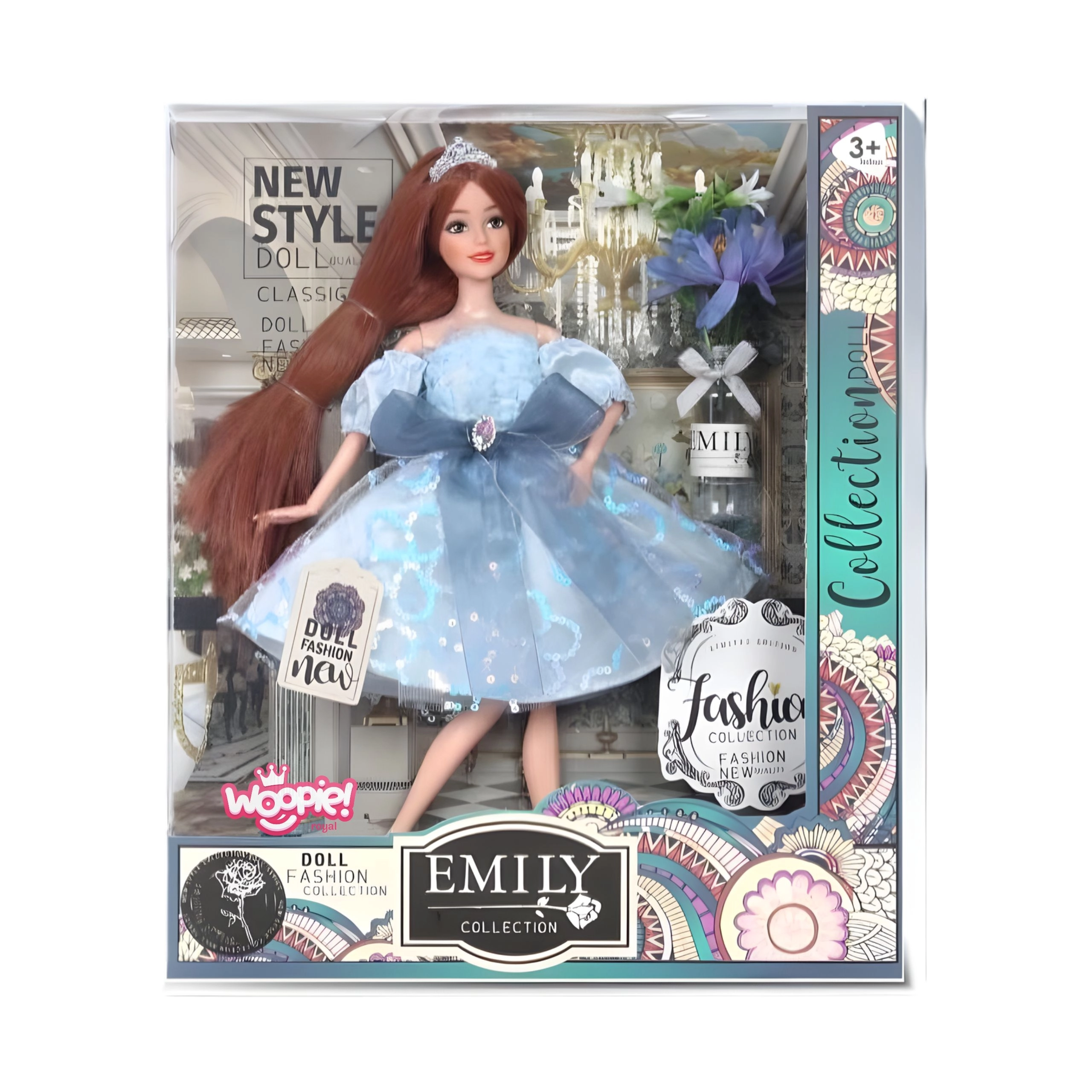 Objavte čaro módy s bábikou Emi od značky Woopie Royal. Blankytné trblietavé šaty s jemným tylom, mašľou a kráľovskou korunkou podčiarkujú jej elegantný vzhľad. Pohyblivé ruky a nohy umožňujú rôzne pózy a kreatívne štýlovanie, vďaka čomu sa každá hra premení na magické dobrodružstvo.