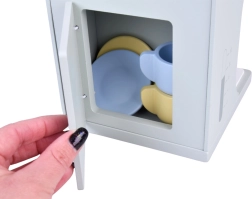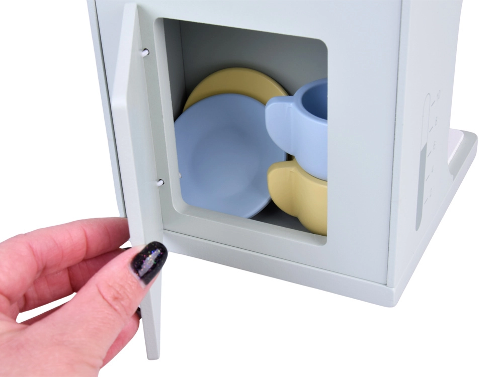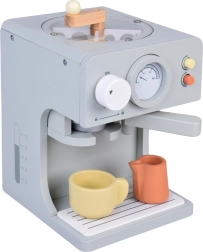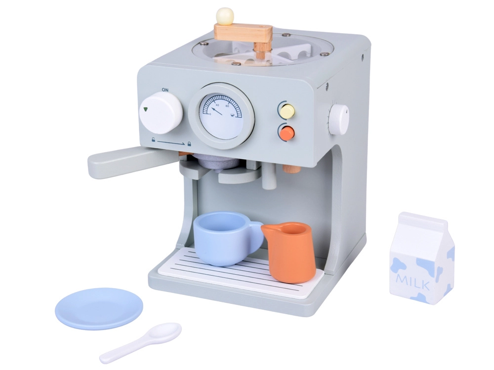 Tento elegantný detský kávovar z dreva v moderných pastelových farbách ponúka všetko pre hru na baristu. Vďaka interaktívnym prvkom, ako sú gombíky, páka portafiltra, ukazovateľ tlaku, tlačidlá či „napenovač“, pôsobí hra prirodzene a realisticky. Hladké hrany a netoxické farby zabezpečujú každodenné bezpečné používanie.
