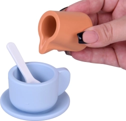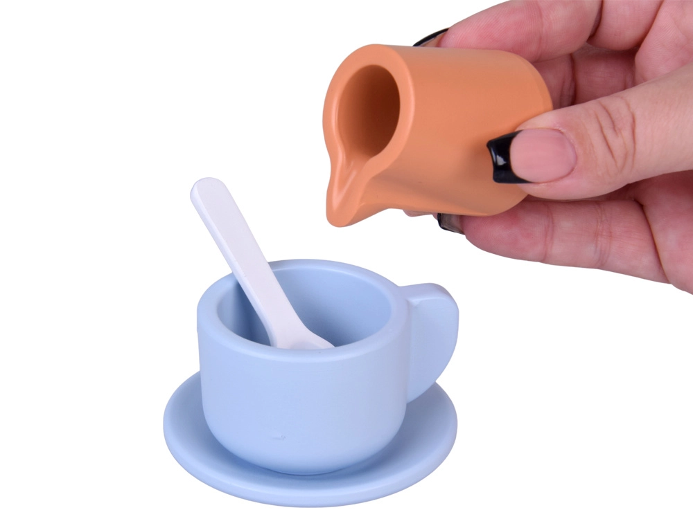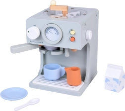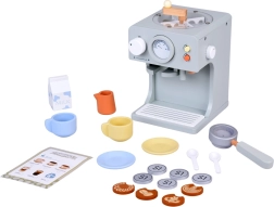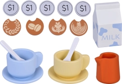 Súčasťou je kompletná sada doplnkov: hrnčeky s podšálkami a lyžičkami, džbánik, kartón „mlieka“, drevené mince a latte art žetóny na kreatívne zdobenie. Deti môžu podľa menu pripraviť espresso, cappuccino, latte alebo americano a obslúžiť rodinu aj kamarátov – ako v skutočnej kaviarni.