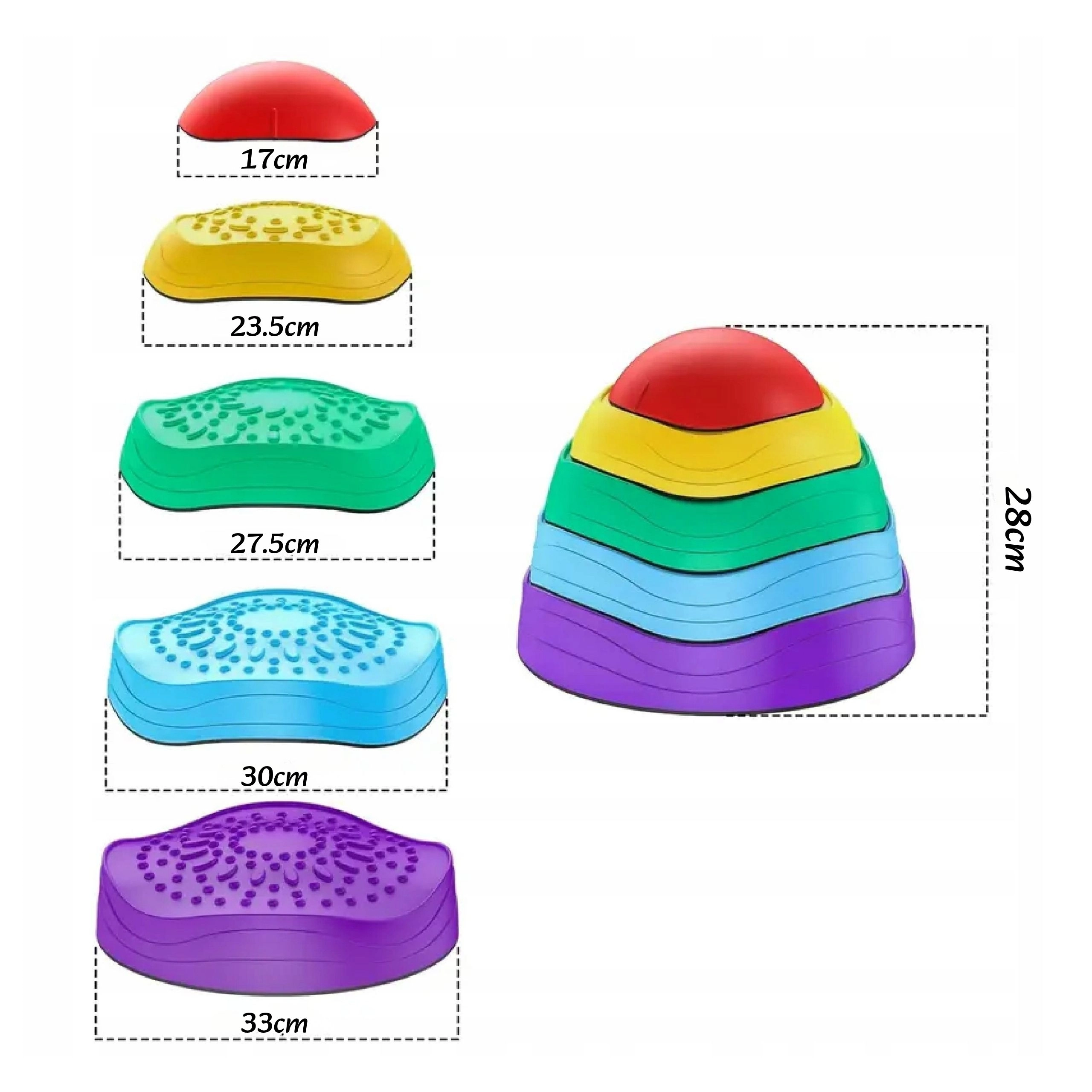 Farebné balančné kamene pre deti od 3 rokov rozvíjajú rovnováhu, koordináciu a hrubú motoriku. Vďaka protišmykovej základni, rôznym textúram a veľkostiam sú ideálne na tvorbu prekážkových dráh, hry a kreatívny pohyb. Stohovateľné spracovanie uľahčuje ukladanie a pestré farby motivujú k aktívnej hre.