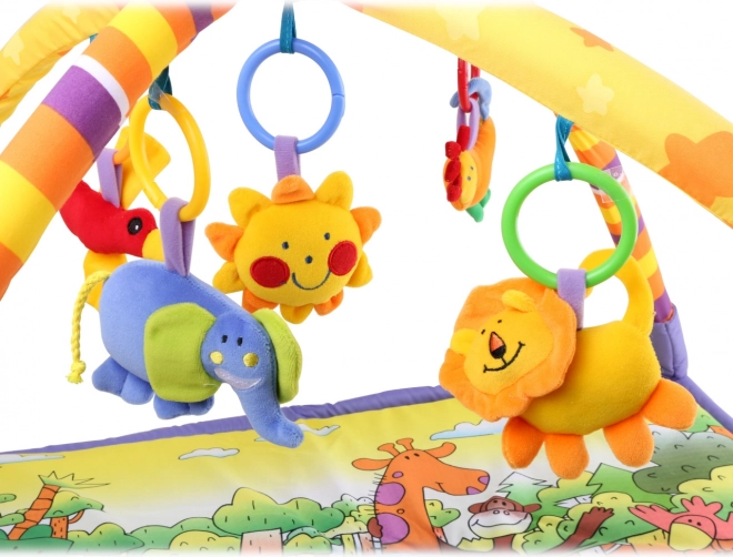 Hračky rôzne hrkajú a pískajú, čím podporujú rozvoj sluchu, hmatu a jemnej aj hrubej motoriky. Vďaka otváracím krúžkom ich ľahko odopnete a dieťa si môže svojich obľúbených kamarátov vziať so sebou. Deka je skladná, rýchlo ju rozložíte aj zložíte a vďaka prenosnej plastovej taške ju vezmete kamkoľvek.