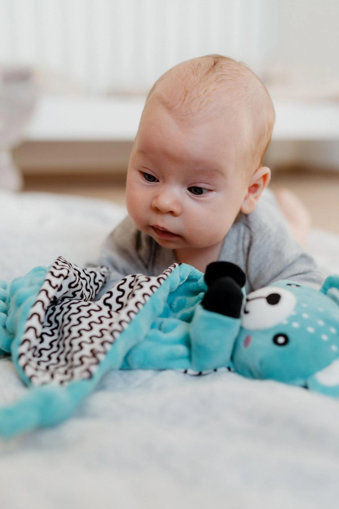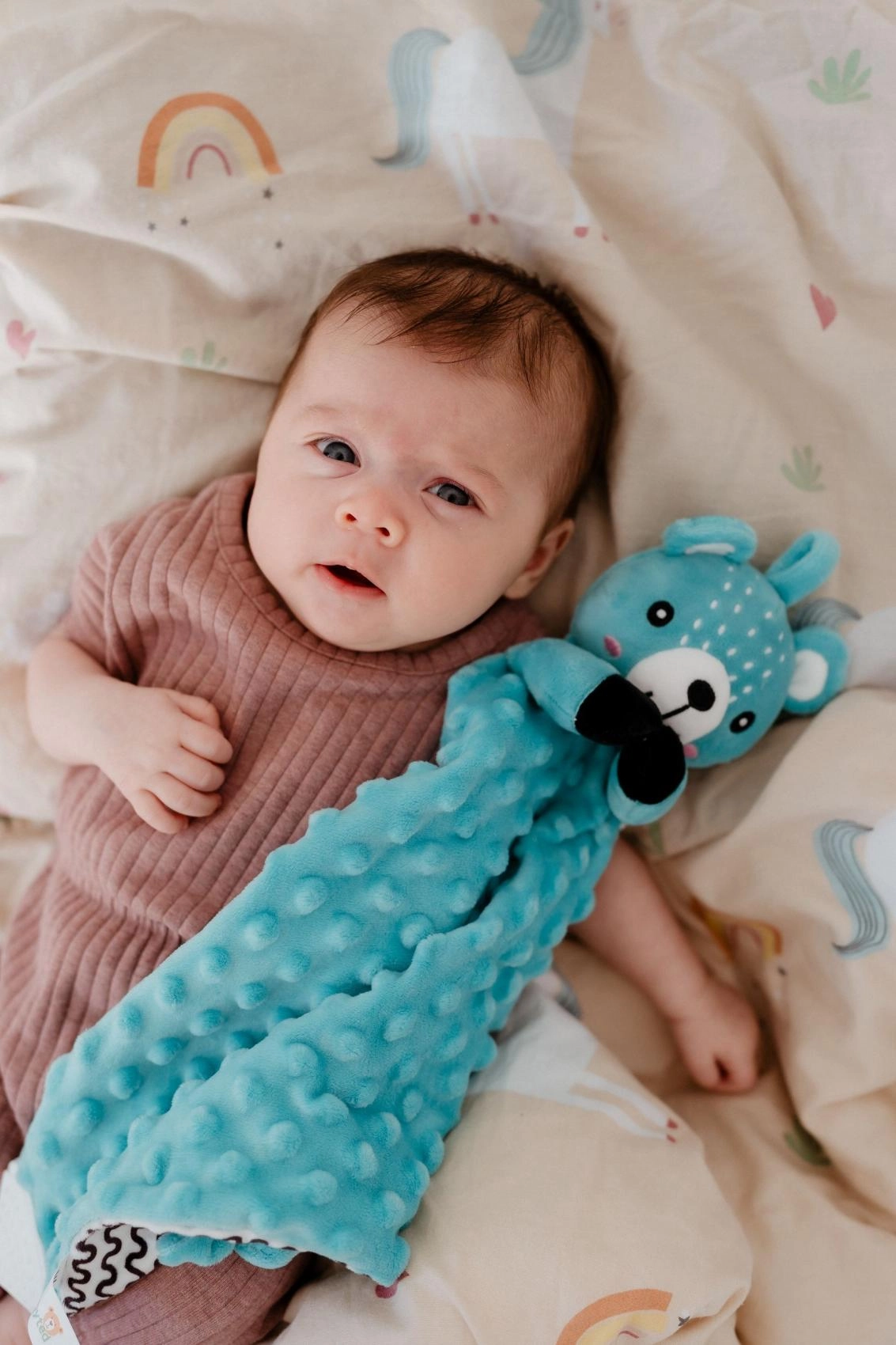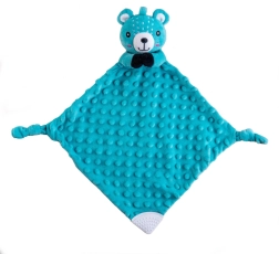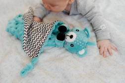 Hebučký mojkáčik s hlavou rozkošného medvedíka z mäkkého minky s 3D bodkami poskytne bábätku pocit bezpečia, ukľudnenie pri zaspávaní a jemnú zmyslovú stimuláciu. Vo vnútri medvedíka je tiché hrkálka na podporu sluchu a v rohu mäkké silikónové hryzátko na úľavu pri prerezávaní zúbkov.