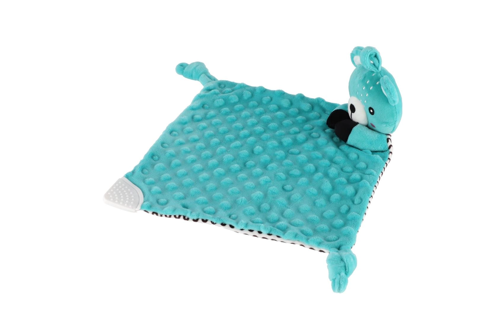 Jedno z ramien dečky je doplnené mäkkým silikónovým hryzátkom, ktoré uľaví citlivým ďasnám. Uzlíky v rohoch sú ľahko uchopiteľné pre malé rúčky a podporujú rozvoj jemnej motoriky. Produkt je certifikovaný v SR a spĺňa bezpečnostné štandardy pre novorodencov.