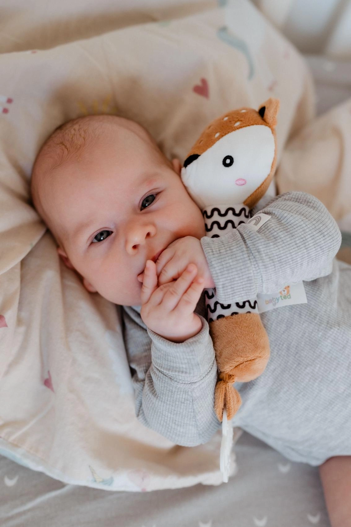 Hľadáte prvú zmyslovú hračku pre novorodené bábätko? Tento srnček kombinuje pískatko, jemné hryzátko a plyšového maznáčika v jednom. Dlhé, mäkké telíčko skvele padne do malých dlaní a podporuje úchop, zatiaľ čo písknutie po stlačení jemne stimuluje sluch a prirodzenú zvedavosť.