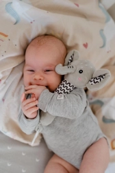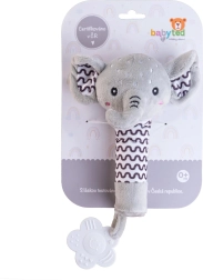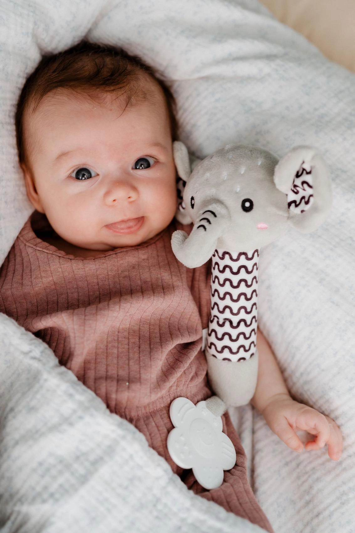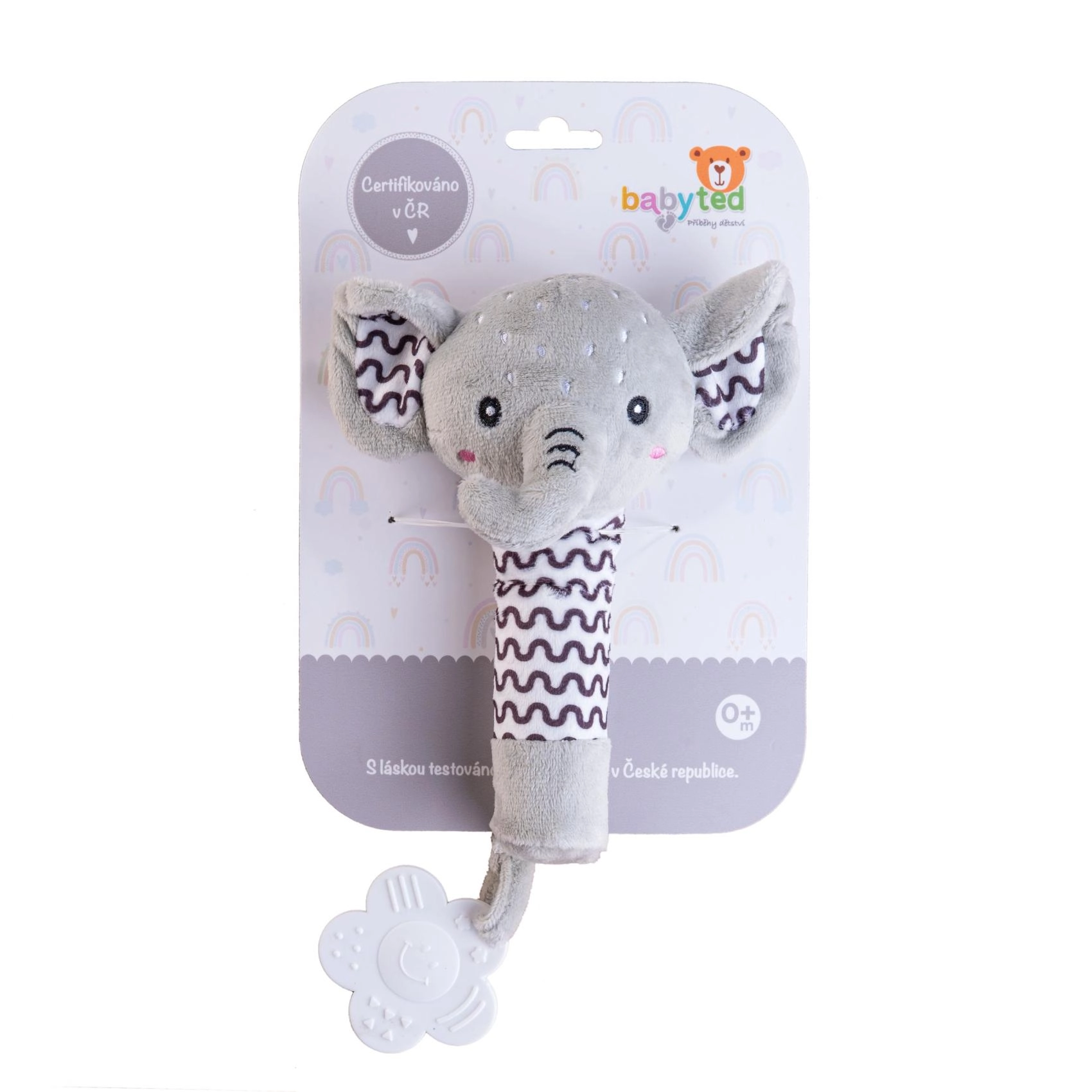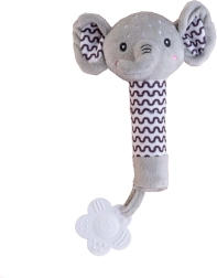 Plyšový slon s pískatkom a hryzátkom je ideálna prvá hračka pre novorodenca. Vďaka ergonomickému, pozdĺžnemu tvaru sa ľahko drží aj v drobných rúčkach, jemné písknutie stimuluje sluch a priťahuje pozornosť bábätka. Hebký, bezpečný materiál poskytuje príjemný dotyk a upokojujúci pocit pri mojkaní.