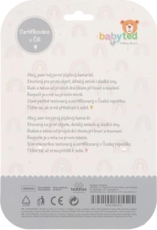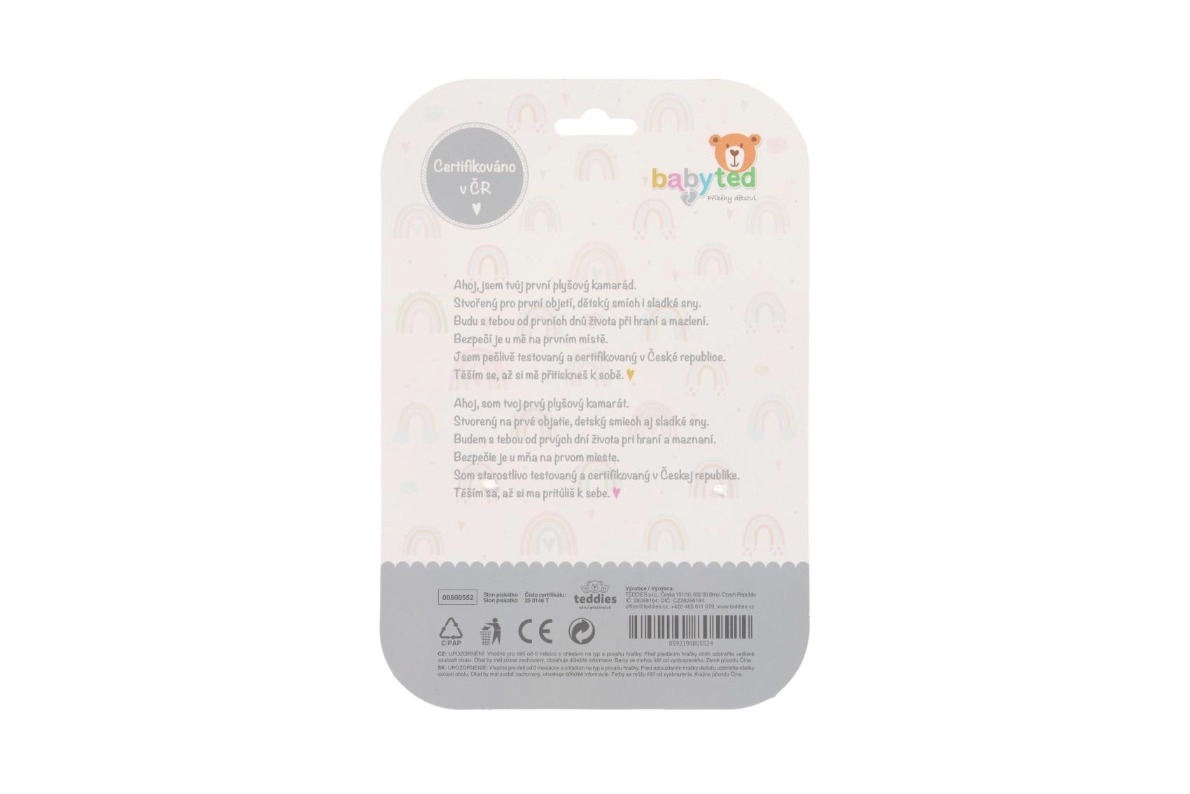 Na konci držadla je mäkké plastové hryzátko v tvare kvietku, ktoré pomáha uľaviť citlivým ďasnám pri prerezávaní zúbkov. Kontrastné vzory na uškách a telíčku podporujú vizuálne vnímanie a rozvoj zmyslov. Hračka je certifikovaná v ČR, takže spĺňa prísne štandardy bezpečnosti pre deti 0m+.