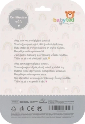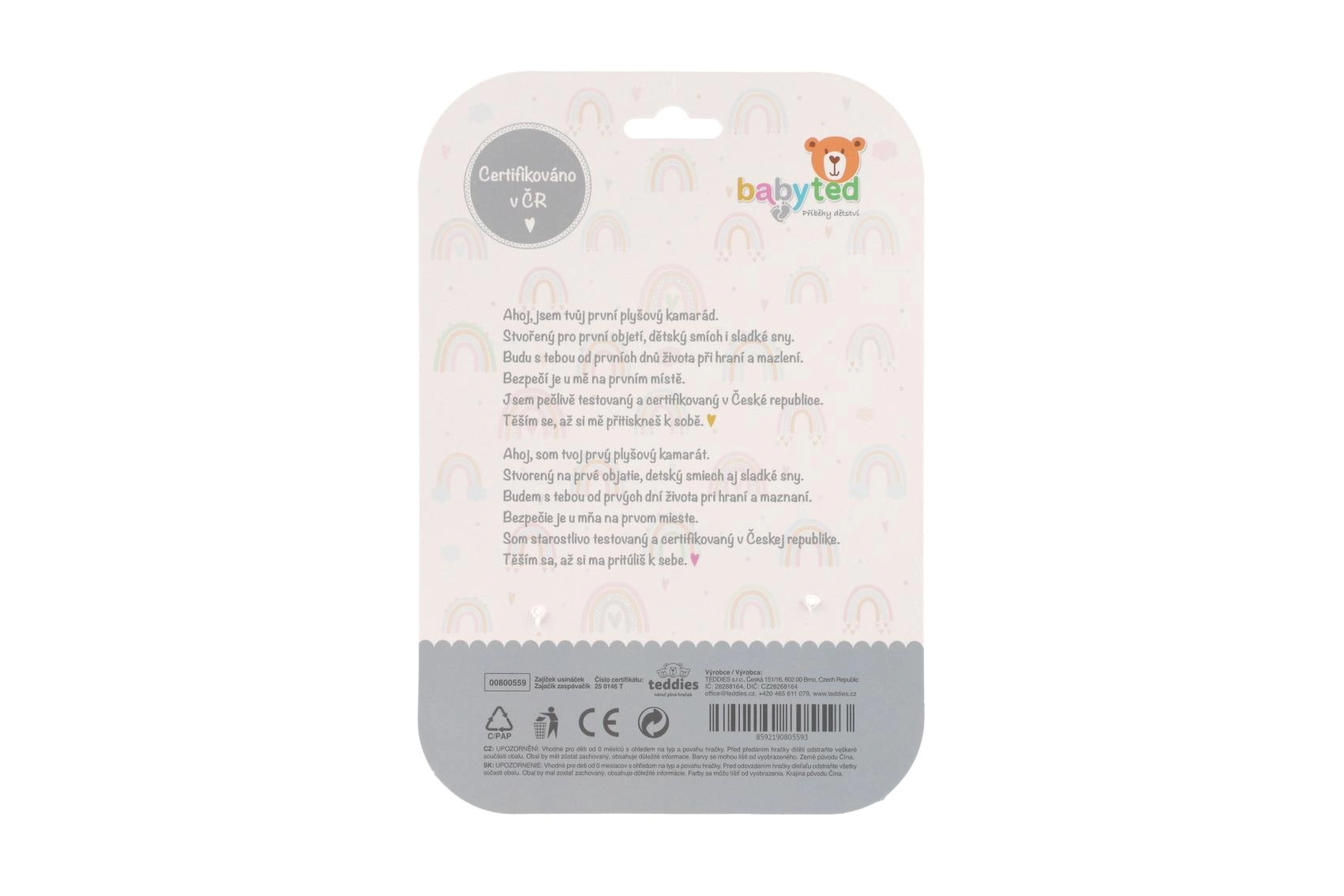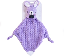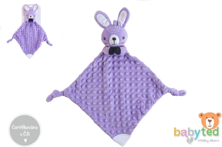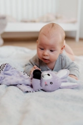 Vo vnútri je ukrytá jemná hrkálka na rozvoj sluchu, v jednom rohu mäkké silikónové hryzátko na úľavu boľavým ďasnám a na rohoch uzlíky podporujúce jemnú motoriku. Praktická veľkosť 25 × 25 cm je ideálna do postieľky, kočíka aj autosedačky.