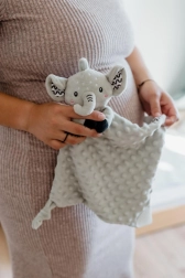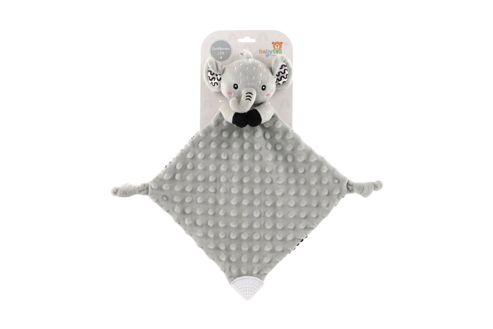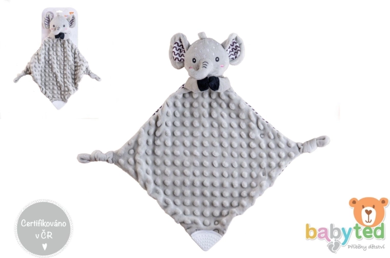 Doprajte svojmu bábätku upokojujúceho parťáka na každý deň. Sloní uspávací maznáčik BABYTED je vyrobený z mimoriadne príjemného minky s výraznou 3D štruktúrou, ktorá stimuluje hmat a vyzýva k mojkaniu. Vďaka ľahkej konštrukcii a uzlíkom na rohoch ho ľahko uchopia aj tie najmenšie ručičky.