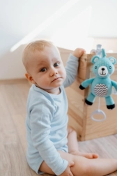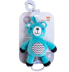 Tento závesný plyšový medvedík je navrhnutý pre pokojné zaspávanie a zábavu na cestách. Po zatiahnutí za pútko sa spustí melodická uspávanka, ktorá pomôže bábätku sa upokojiť. Vďaka praktickému klipu hračku ľahko pripevníte na postieľku, kočík, autosedačku alebo hraciu hrazdičku.