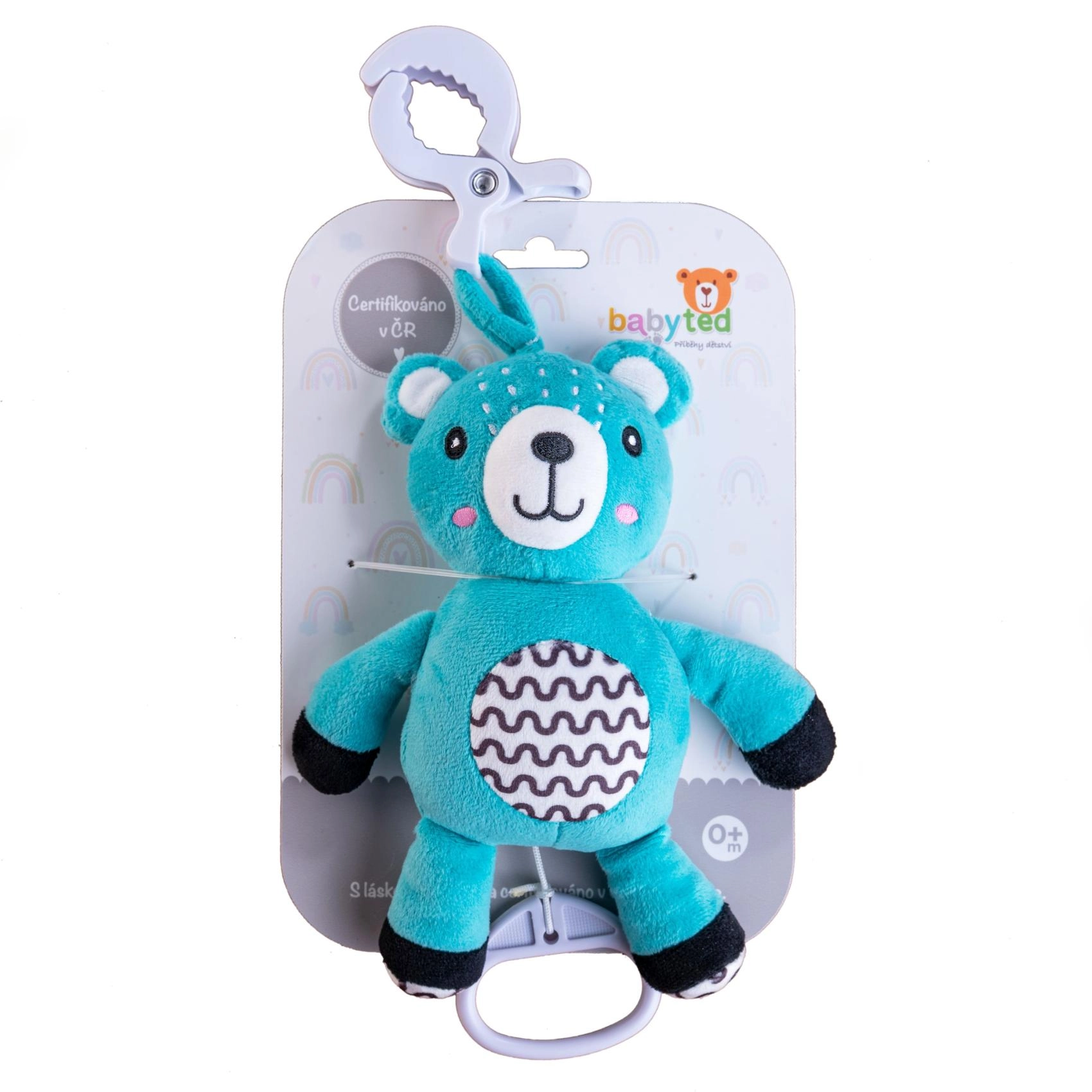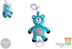 Roztomilý plyšový medvedík s klipom a naťahovacím hracím strojčekom prehráva jemnú uspávanku na upokojenie bábätka. Ľahko ho zavesíte na postieľku, kočík či autosedačku, takže bude maznivý parťák vždy po ruke. Mäkký hebký plyš a kontrastné vzory podporujú zmyslový rozvoj od narodenia. Certifikované v ČR na bezpečné používanie 0m+.