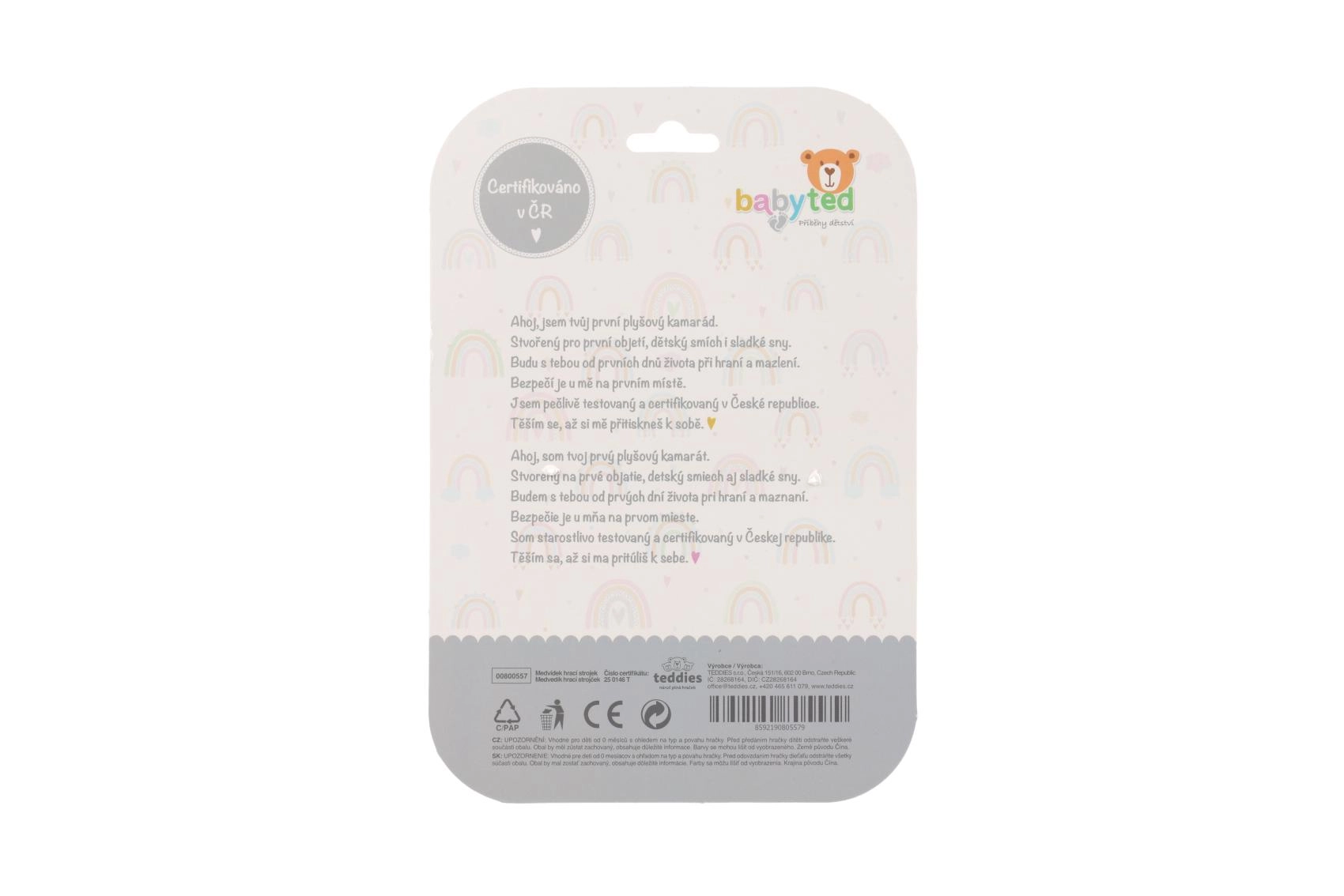 Mäkučký plyšový materiál je príjemný na dotyk a vhodný na prvé objavovanie textúr, zatiaľ čo kontrastné vzory na brušku podporujú vizuálne vnímanie. Hračka je certifikovaná v ČR a vhodná pre deti od narodenia (0m+).