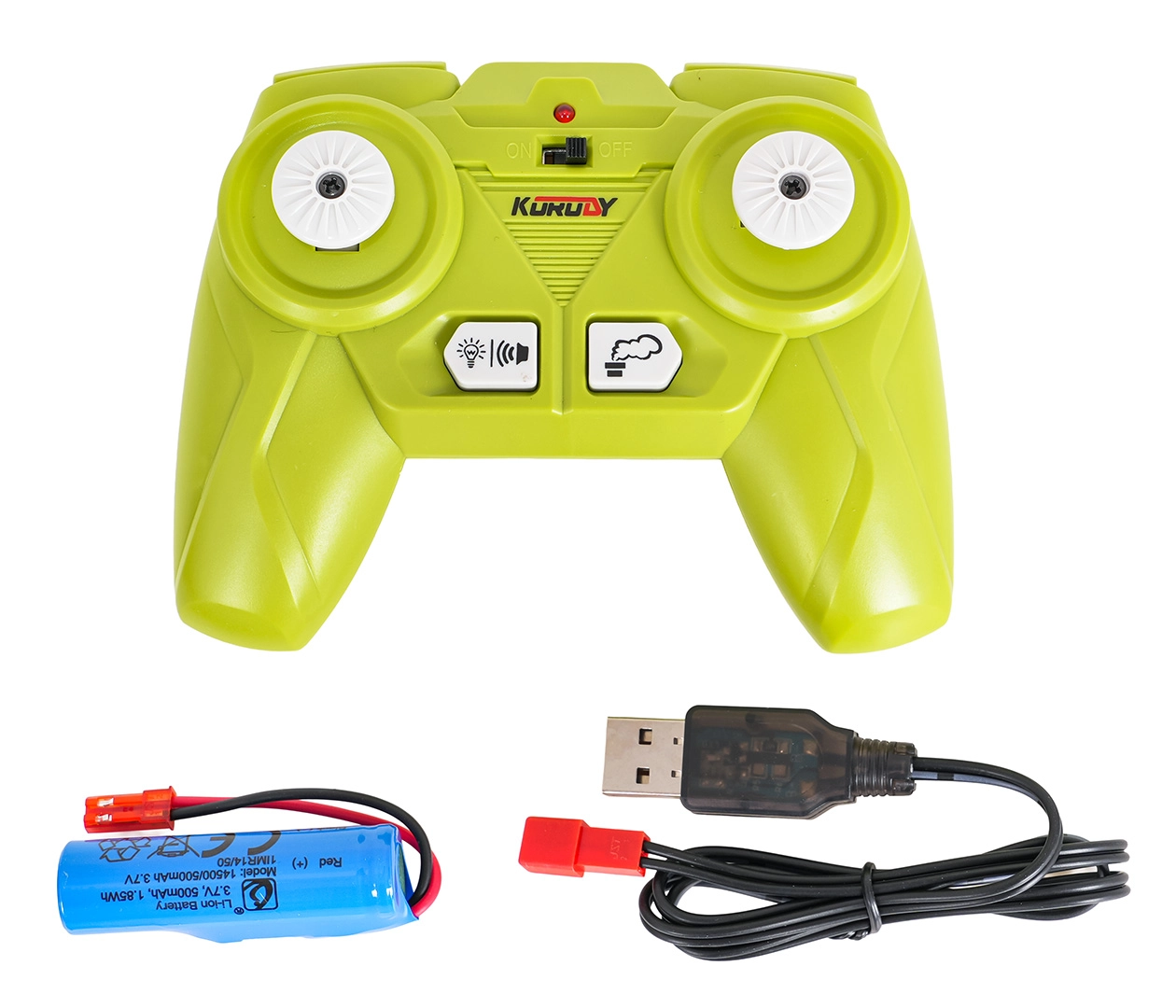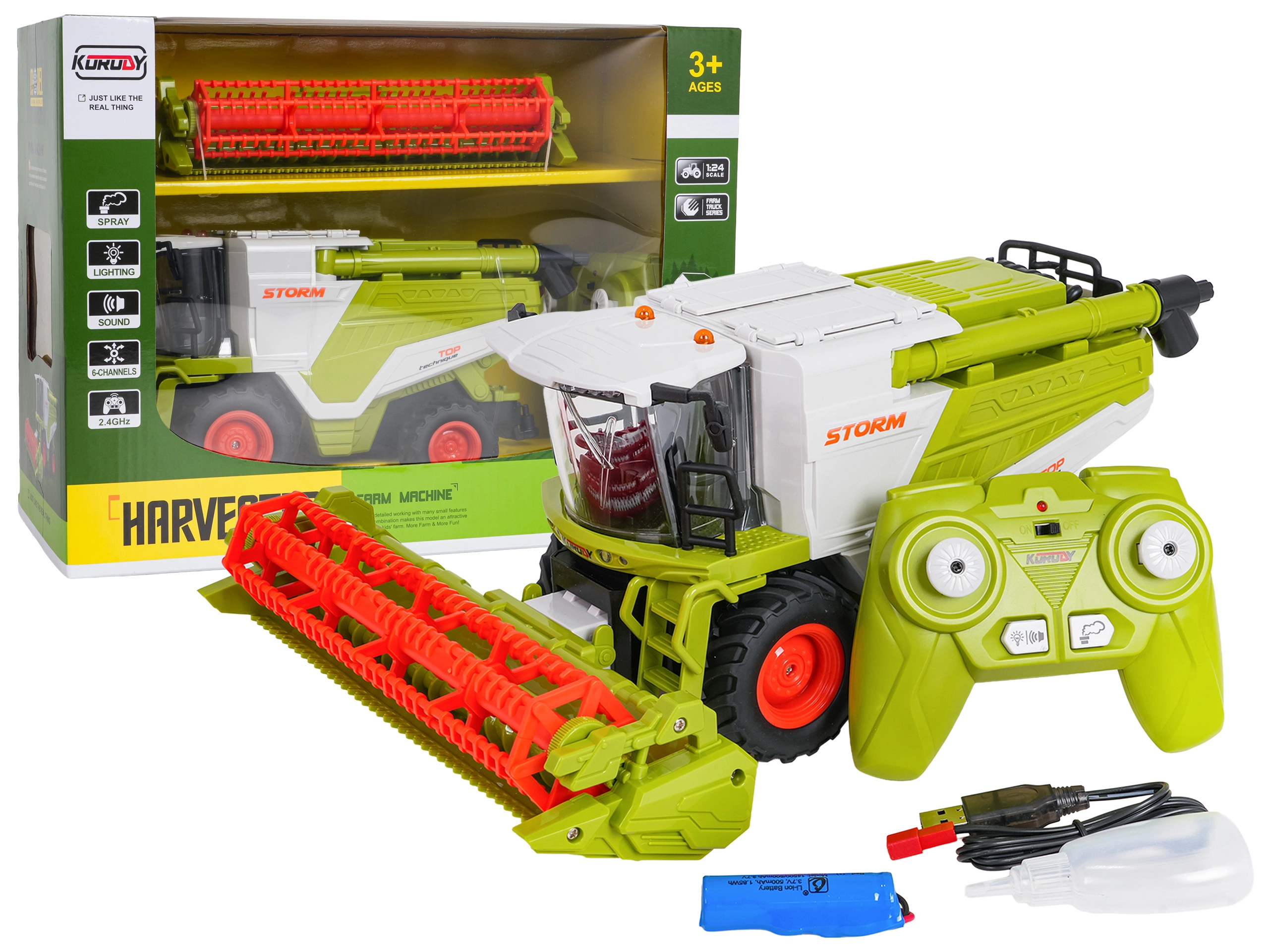 - Kombajn s hederom, diaľkový ovládač 2,4 GHz, akumulátor 3,7 V, USB nabíjací kábel, pipeta na vodu