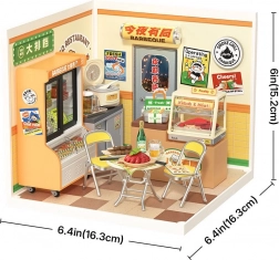 Objavte čaro pouličnej gastronómie s miniatúrou reštaurácie, ktorá je plná farieb, ikonických nápisov a autentických detailov. Nájdete tu chladničku s nápojmi, grilovací pult, ryžovar aj ponuku omáčok – všetko precízne spracované do posledného dieliku. Vstavané LED osvetlenie podčiarkne atmosféru nočného bistra a premení model na štýlovú dekoráciu.