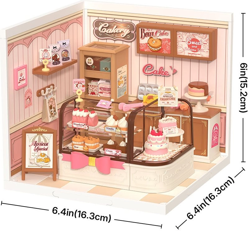 Objavte kúzlo miniatúrnej cukrárne, kde nechýbajú tortičky, rolády ani vrstvené dezerty, ktoré vyzerajú na zahryznutie. Uprostred zaujmú sklenené vitríny a dvojica pultov – jeden rovný a druhý elegantne zakrivený – s vystavenými cupcakes a makrónkami s farebnými štítkami. Nechýbajú kliešte na výdaj a ďalšie dobroty ukryté vzadu, ktoré dotvárajú autentickú atmosféru.