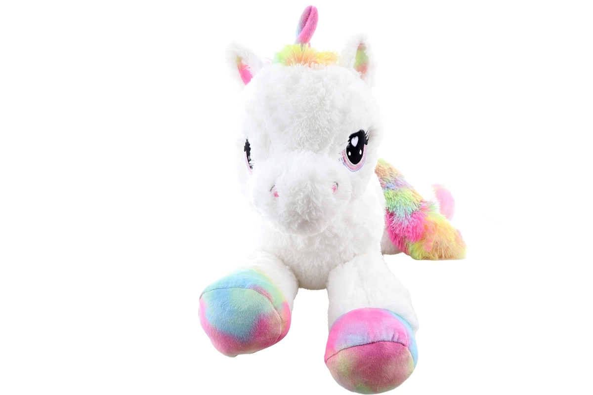 Tento biely plyšový jednorožec s dúhovými kopýtkami, hrivou a chvostíkom sa stane verným spoločníkom pri oddychu aj hre. Je vyrobený z mimoriadne jemnej plyše, ktorá láka k objatiu, a vďaka ležiacej polohe sa krásne zmestí na posteľ aj do detskej izbičky.