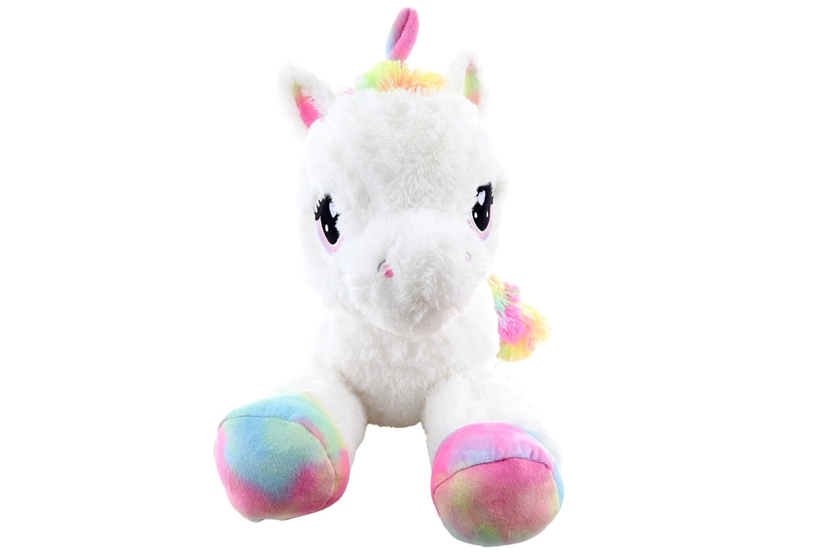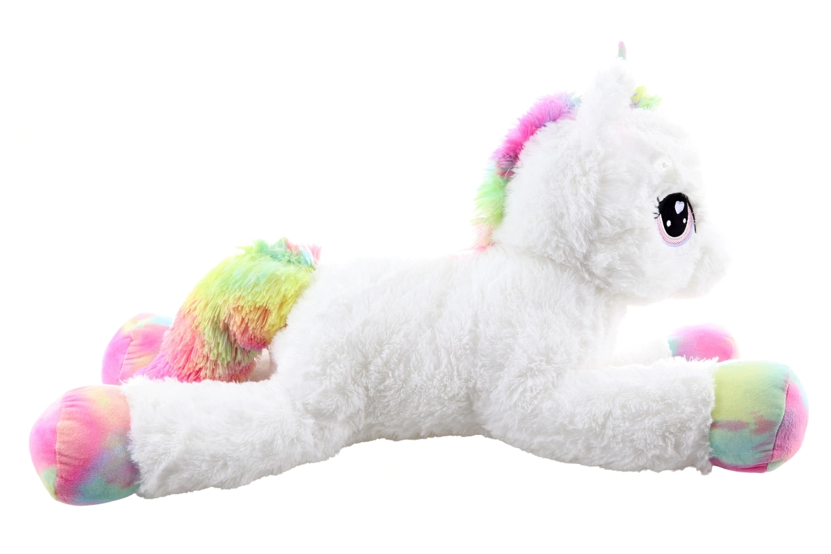 Roztomilý plyšový jednorožec s dĺžkou 80 cm poteší deti aj dospelých. Je mimoriadne mäkký, príjemný na dotyk a ideálny na túlenie. Farebné dúhové detaily dodávajú hračke čarovný vzhľad, veľké vyšívané oči a jemné prevedenie zaručujú bezpečné používanie od 0+.