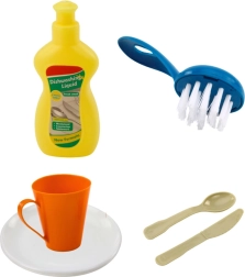 - Drez s kohútikom a obehom vody, zelený tanierik, ružová miska, 3× kelímok, nôž, lyžica, vidlička, kefka na riad, škrabka/špachtľa, fľaša „jaru“