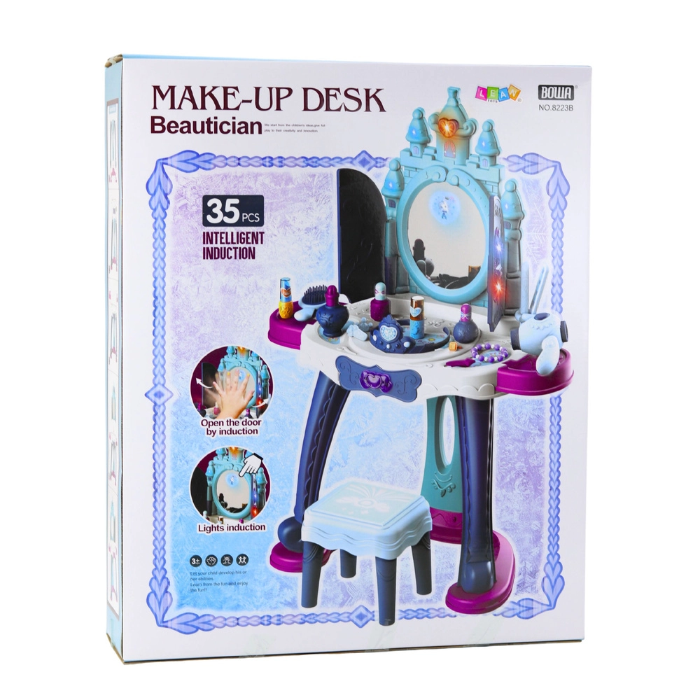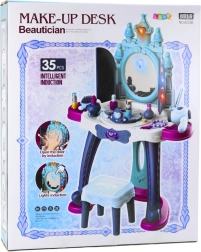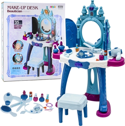 Kúzelný interaktívny toaletný stolík pre deti premení izbu na svet princezien. Ponúka svetelné efekty, magické melódie, otváracie dvierka so zrkadlom a zobrazením princezien. Súčasťou je stolička a bohatá sada 35 doplnkov na kreatívne hranie – od kefy a fénu až po šperky a „kozmetiku“. Pevná a bezpečná konštrukcia z odolného plastu je ideálna pre malé stylistky.