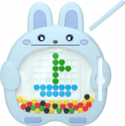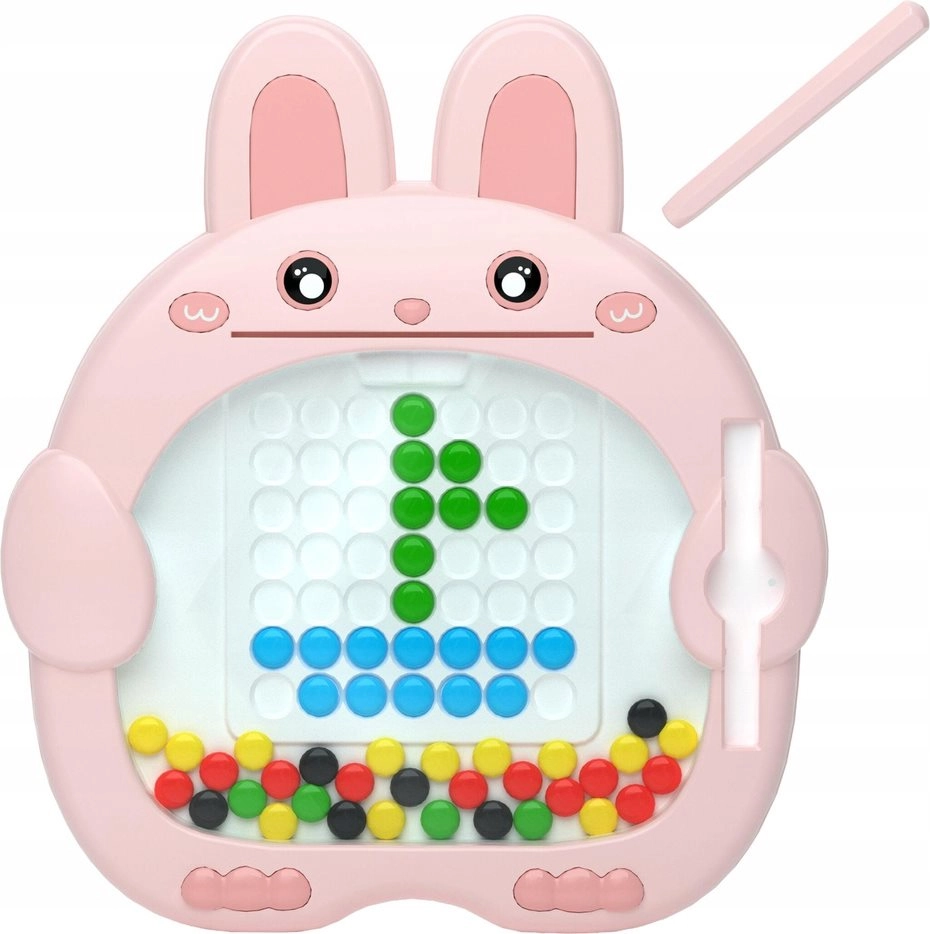 Táto kreatívna magnetická tabuľa v tvare roztomilého zajačika zabaví deti na dlhé hodiny. Magnetické pero ľahko vyťahuje a premiestňuje farebné gombíky v mriežke, takže si deti môžu vytvárať obrázky krok za krokom podľa vložených predlôh alebo úplne podľa seba.