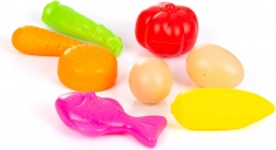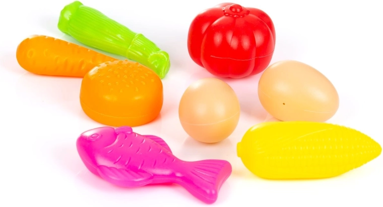 Súprava obsahuje realistické makety ovocia a zeleniny v jasných farbách, ktoré pomáhajú s rozpoznávaním tvarov a podporujú kreatívny role-play.