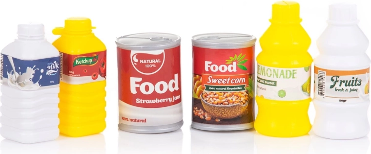 Papierové škatuľky potravín a detské fľaše a plechovky dodajú hre autenticitu – ideálne na zostavovanie nákupných zoznamov a triedenie potravín.