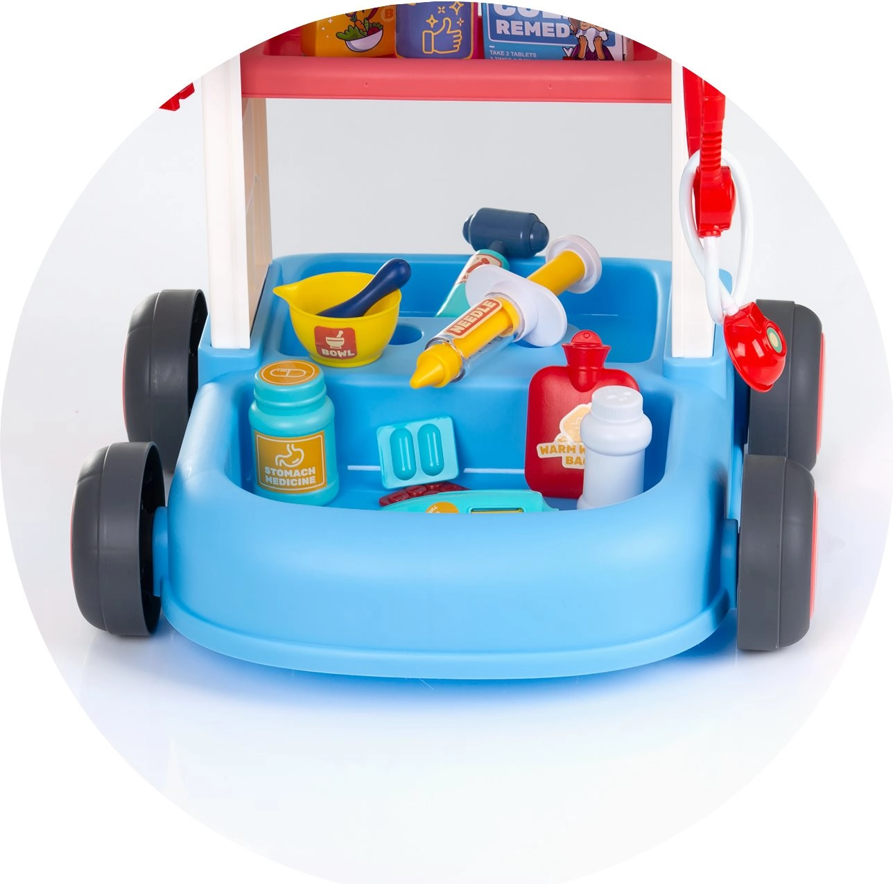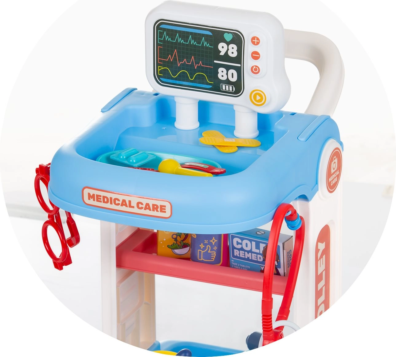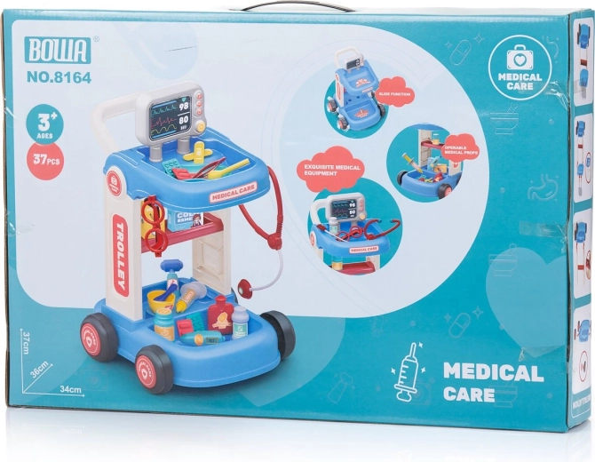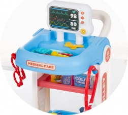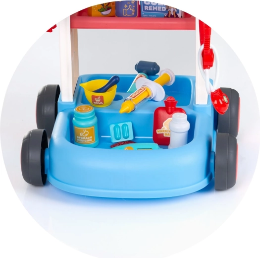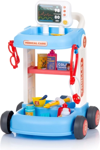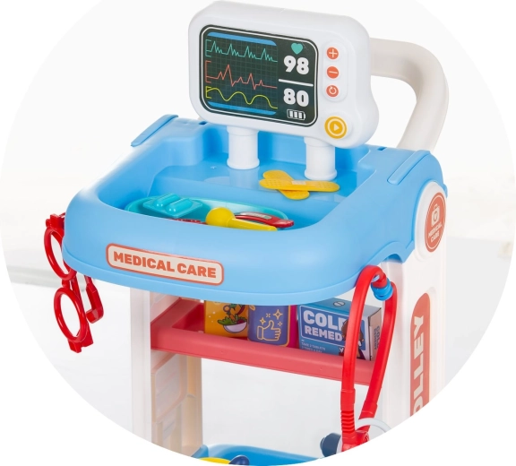 Tento detský lekársky set s pojazdným vozíkom ponúka všetko, čo malý doktor potrebuje na svoje prvé vyšetrenia. Stabilná konštrukcia s kolieskami a madlom umožňuje ľahké presúvanie po miestnosti, zatiaľ čo police a priehradky udržia všetky nástroje prehľadne po ruke. Vďaka bohatej výbave si deti môžu vyskúšať základné lekárske úkony a precvičiť empatiu aj komunikačné zručnosti.