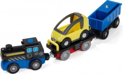 Lokomotíva s uhoľným a klátovým vozňom vtiahne deti do sveta železnice. Odpájanie a pripájanie vagónov podporuje jemnú motoriku a predstavivú hru.