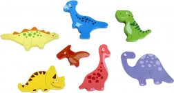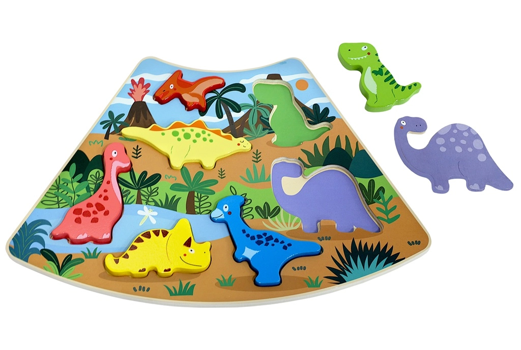 Toto drevené vkladacie puzzle s dinosaurami je ideálne na prvé skladanie. Hrubé, hladké dieliky sa ľahko uchopujú, deti ich vkladajú do zodpovedajúcich tvarov a trénujú koordináciu oko–ruka. Vďaka výrazným farbám a roztomilým ilustráciám sa deti prirodzene učia rozlišovať farby a tvary.