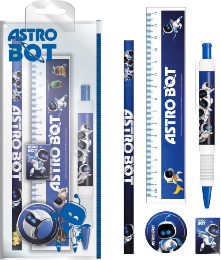 Praktická školská sada s licenciou Astrobot obsahuje všetko potrebné na písanie a meranie. V kompaktnom plastovom puzdre nájdete 15 cm pravítko, strúhadlo, gumu, guľôčkové pero a HB ceruzku – ideálne do školy aj na cesty.