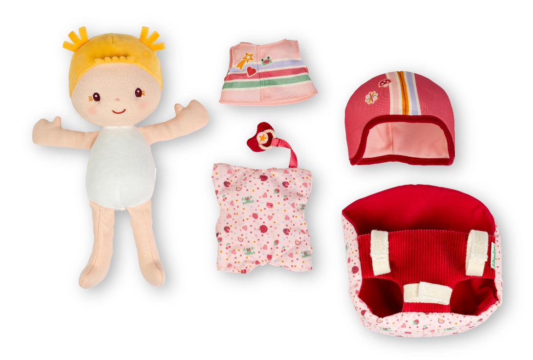 Látková bábika Lena je ideálna parťáčka na výlety. Vďaka mäkkému textilnému telíčku sa skvele túli a podnecuje rolové hry – deti môžu bábiku posadiť do sedačky tvárou k sebe a „starať sa“ o ňu počas jazdy. Magnetický cumlík sa ľahko prikladá a pevne drží, aby sa na výletoch nestratil.