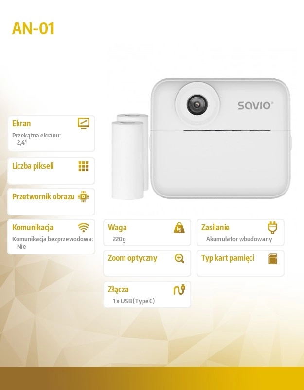 Objavte zábavu z fotenia s detským instantným fotoaparátom SAVIO AN‑101. Vďaka okamžitej čiernobielej tlači bez atramentu, 48 MP snímaču, 2,4" farebnému displeju a selfie režimu deti ľahko zachytia svoje zážitky a ihneď ich zdieľajú. Zabudované hry, batéria 1200 mAh až na 6 hodín a nabíjanie cez USB‑C robia z AN‑101 perfektného spoločníka na doma, dovolenku aj rodinné akcie.